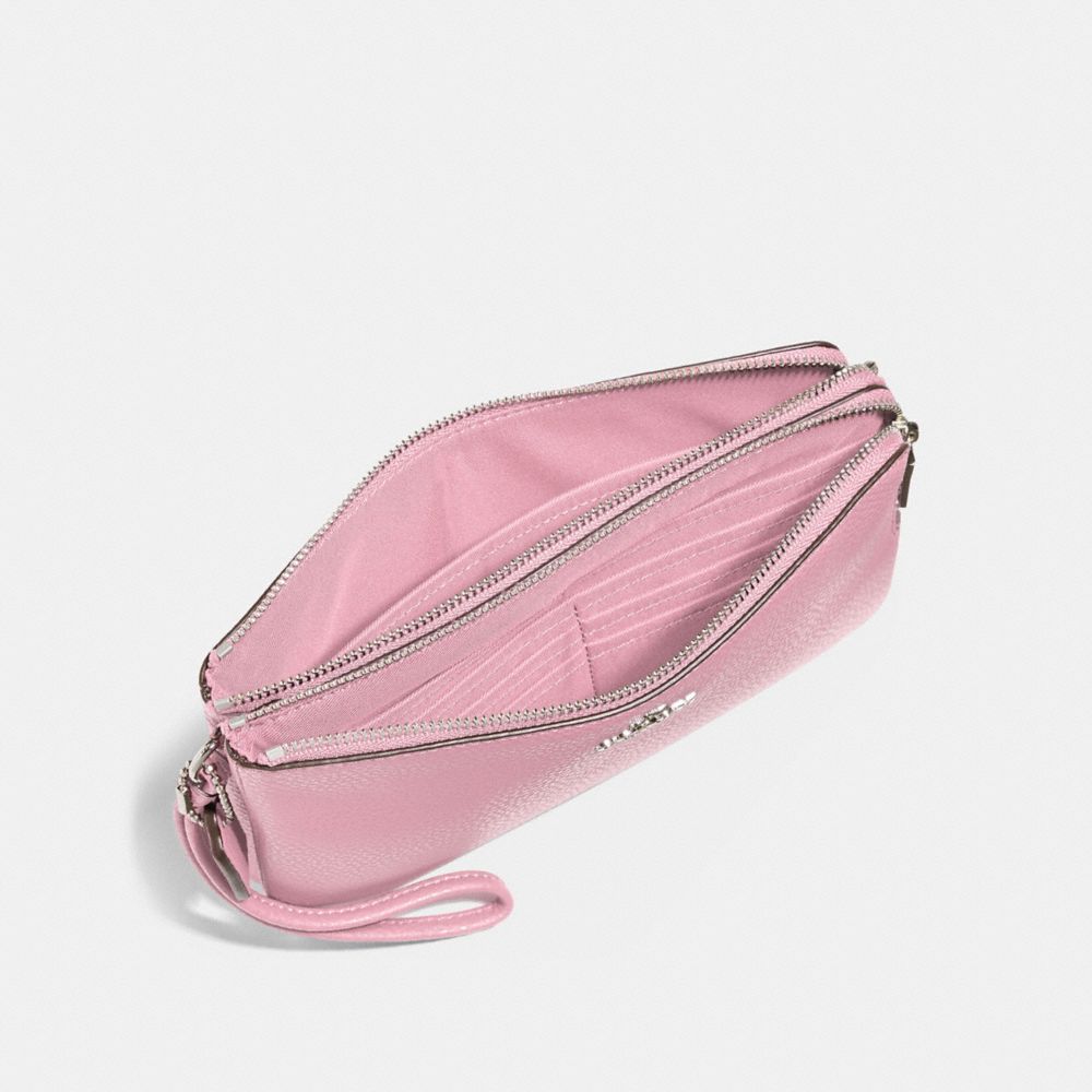 Polished pebble leather| Six credit card slots| Full-length bill compartment| Inside open pockets| Double zip closure, fabric lining| Wrist strap attached| 8" (L) x 4 3/4" (H) x 1 1/4"| Fits all phone sizes up to an iPhone X and Samsung S7 Edge
