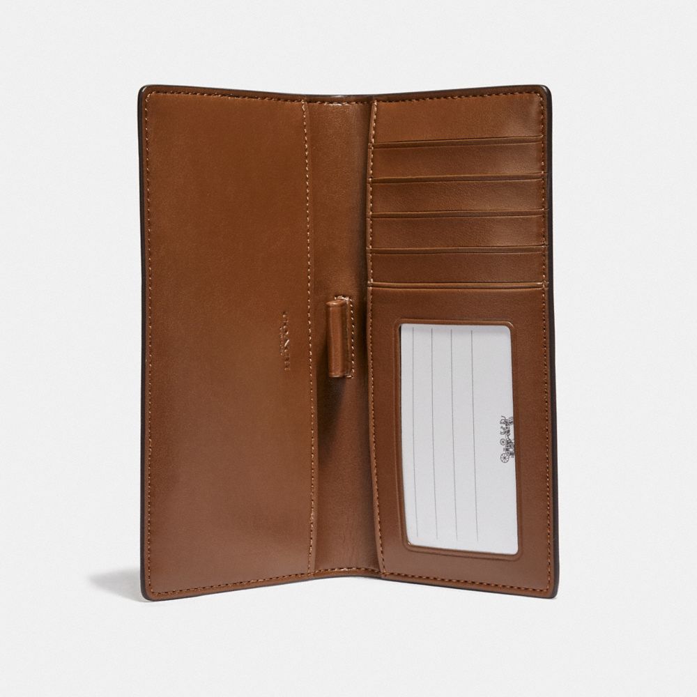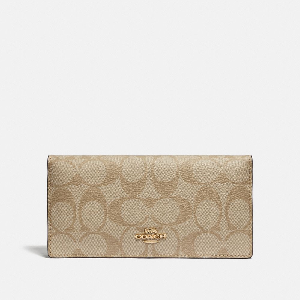 Signature coated canvas| Four credit card slots| ID window| Inside open pockets| 6 3/4" (L) x 3 1/2" (H)