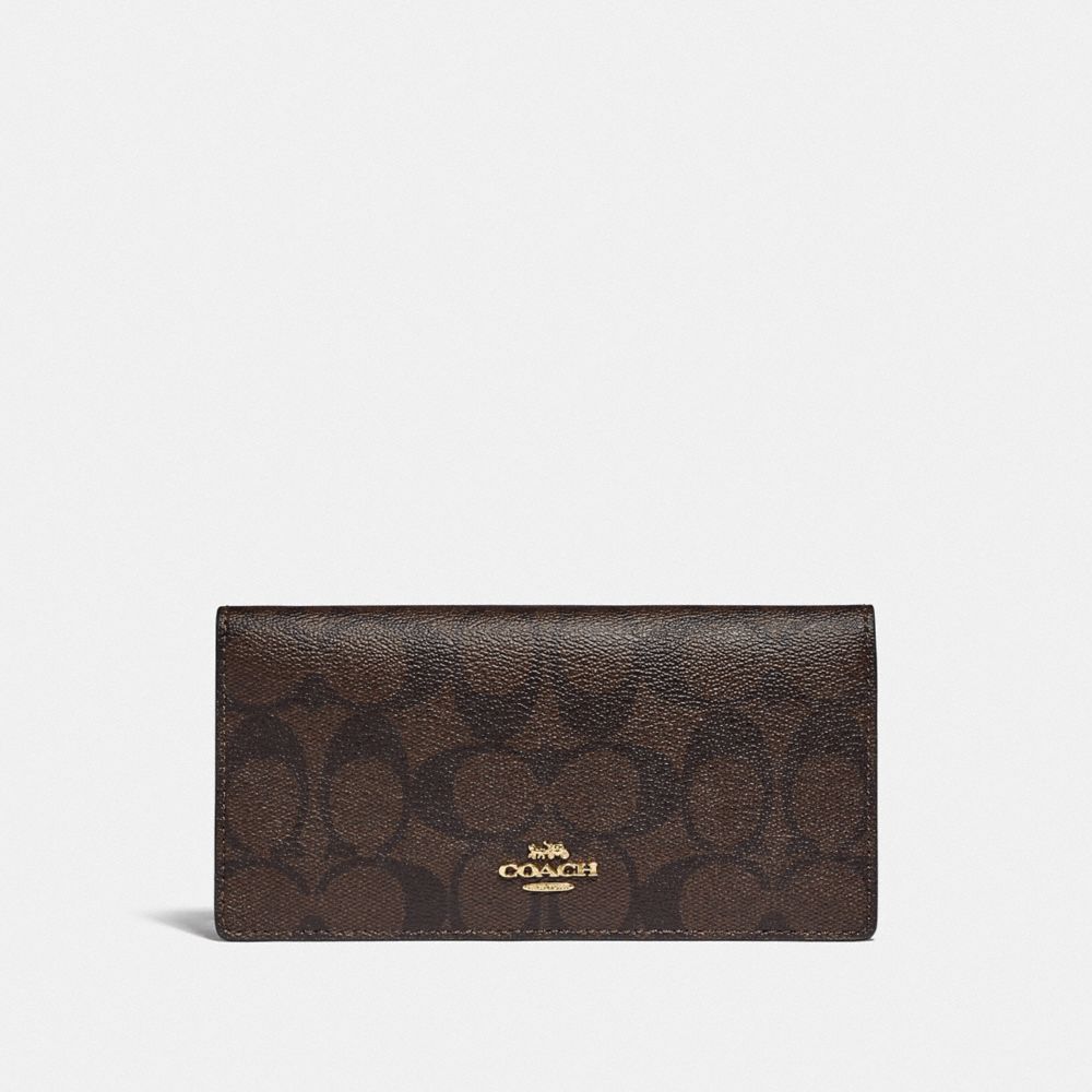 Signature coated canvas| Four credit card slots| ID window| Inside open pockets| 6 3/4" (L) x 3 1/2" (H)