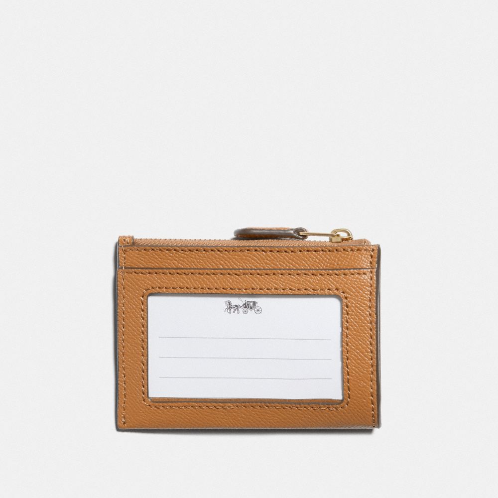 Crossgrain leather| Two credit card slots| ID window| Zip-top closure, fabric lining| Attached split key ring| 4 1/4" (L) x 3" (H) x 1/2" (W)