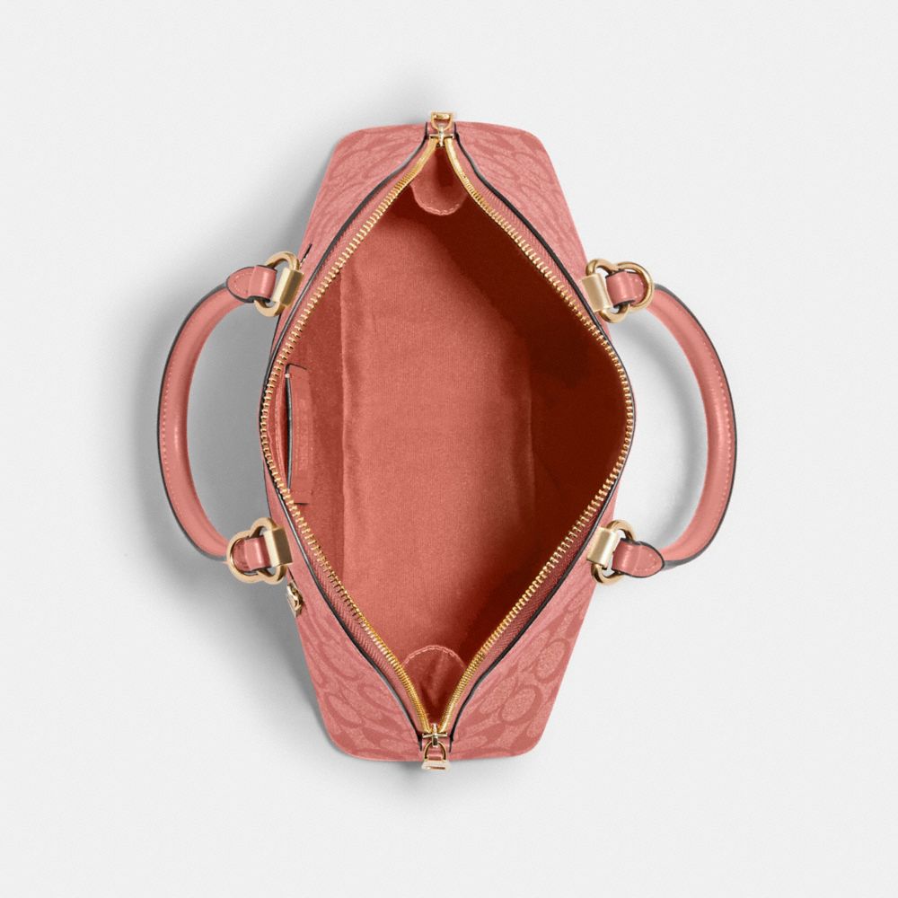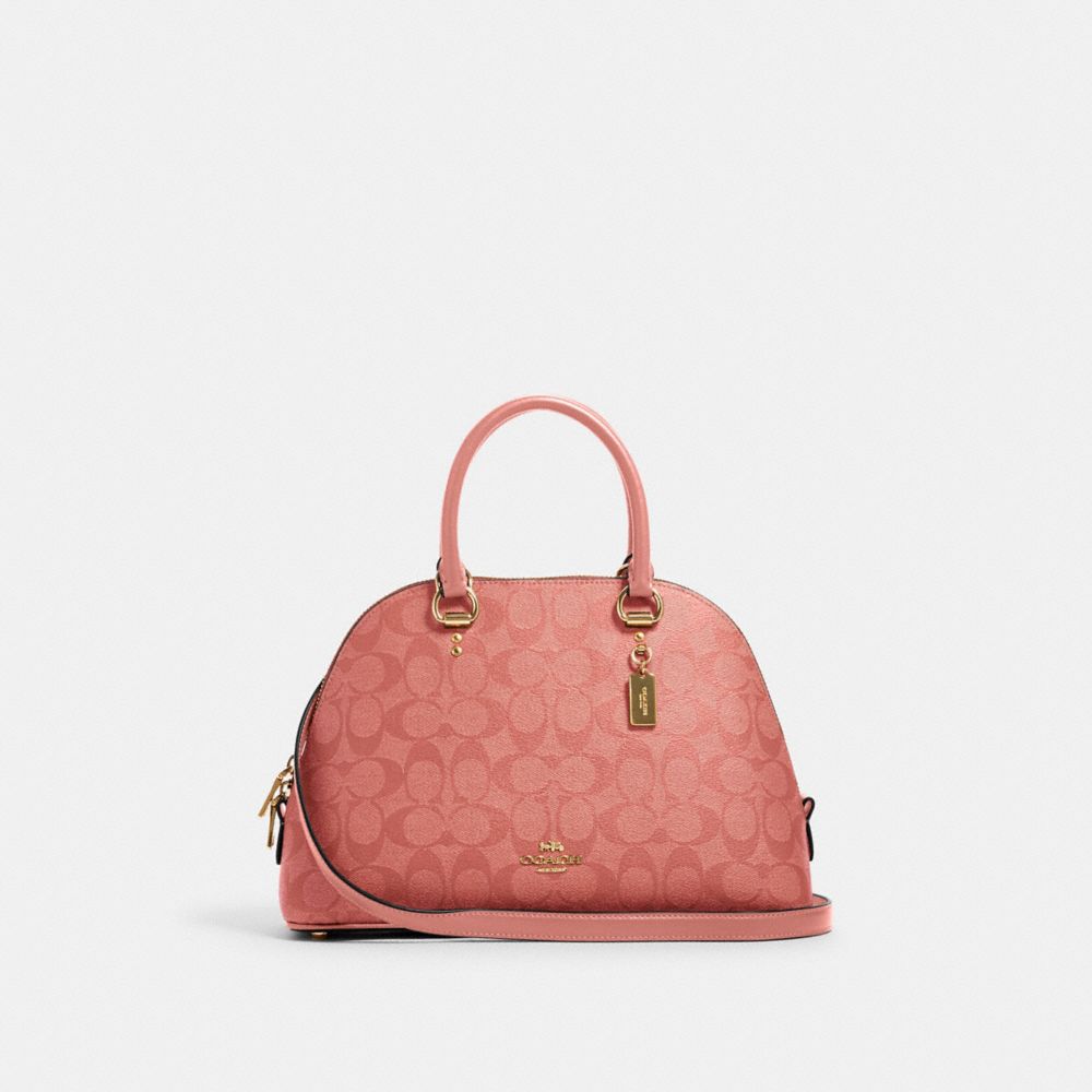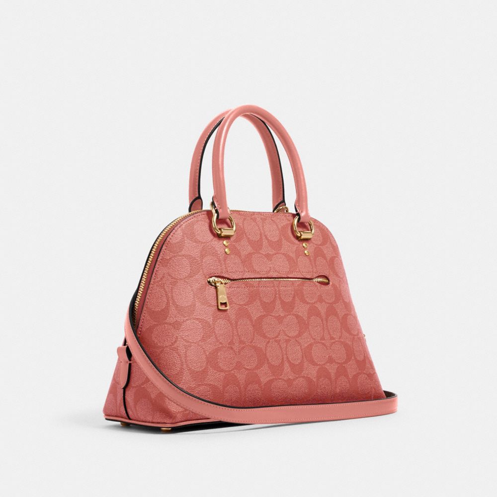 Signature coated canvas and smooth leather| Inside zip pocket| Zip closure, fabric lining| Handles with 3 3/4" drop| Outside zip pocket| Detachable strap with 22" drop for shoulder or crossbody wear| 11 3/4" (L) x 7 3/4" (H) x 4" (W)
