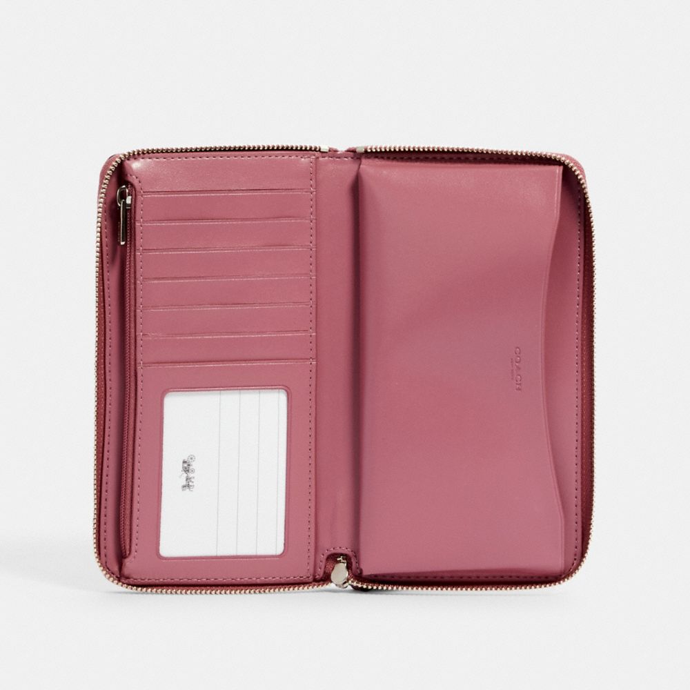 Printed coated canvas with smooth leather details| Six credit card slots| ID window| Zip coin pocket| Inside phone pocket| Zip-around closure| Wrist strap attached| 7 1/4" (L) x 4" (H) x 3/4" (W)