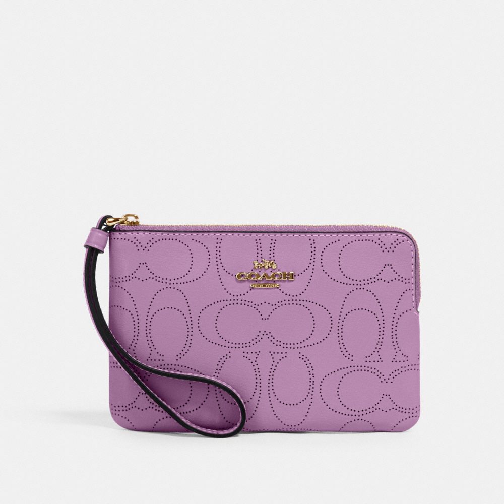 Signature perforated leather| Two credit card slots| Zip-top closure, fabric lining| Wrist strap attached| 6 1/4" (L) x 4" (H) x 1/2" (W)| Fits an iPhone or Android