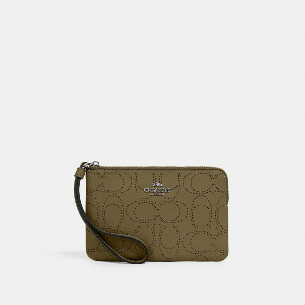 Signature perforated leather| Two credit card slots| Zip-top closure, fabric lining| Wrist strap attached| 6 1/4" (L) x 4" (H) x 1/2" (W)| Fits an iPhone or Android