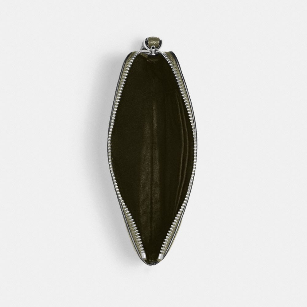 Crossgrain leather| Two credit card slots| Zip-top closure, fabric lining| Wrist strap attached| 6 1/4" (L) x 4" (H) x 1/2" (W)