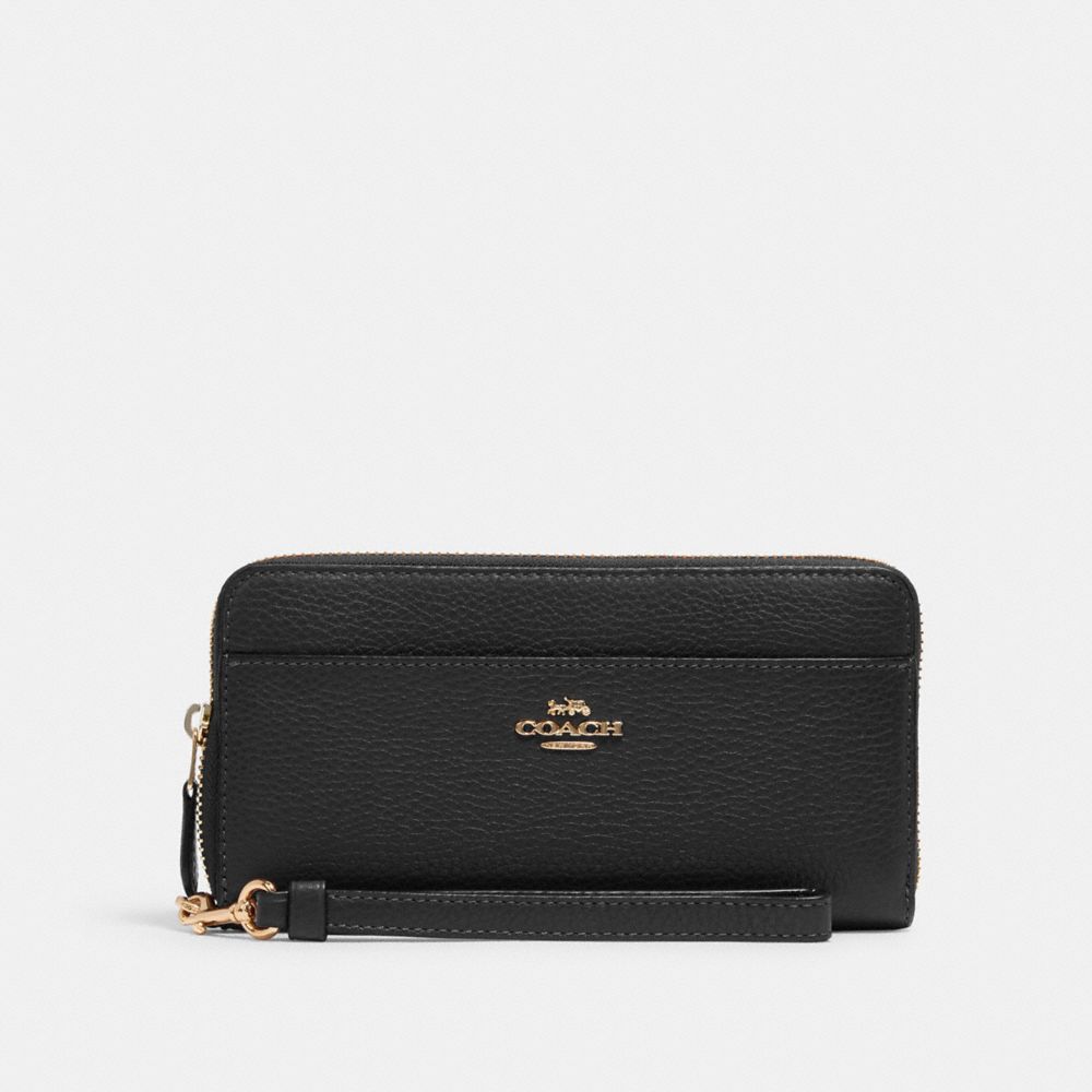 Refined pebble leather| 12 credit card slots| Full-length bill compartments| Zip coin pocket| Zip-around closure| Outside open pocket| Detachable wrist strap| 7 1/2" (L) x 4" (H) x 3/4" (W)| Fits all phone sizes up to an iPhone X and Samsung S7 Edge