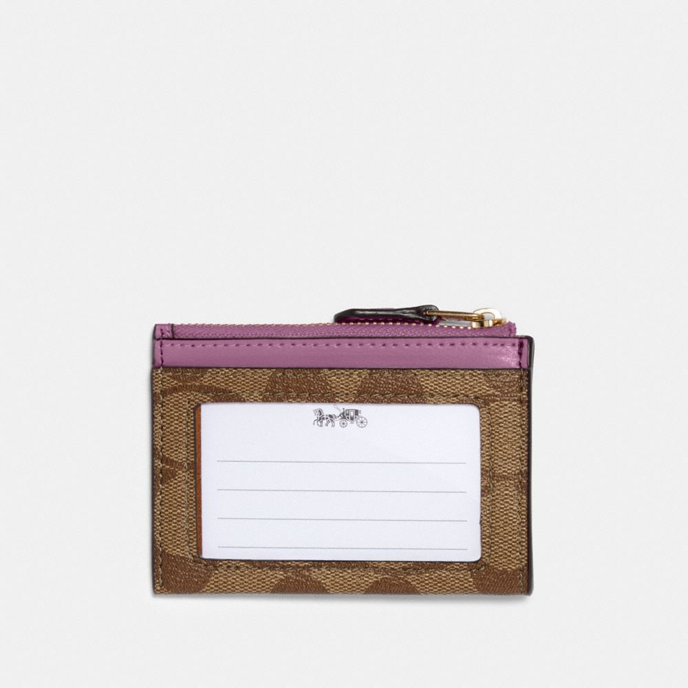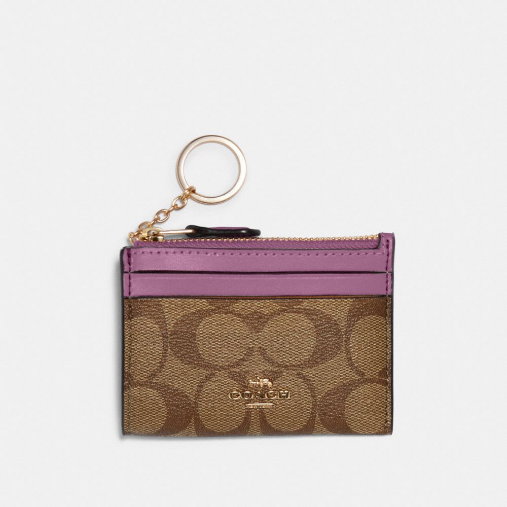 Signature coated canvas and smooth leather| Two credit card slots| ID window| Zip-top closure, fabric lining| Attached split key ring| 4 1/4" (L) x 3" (H) x 1/2" (W)
