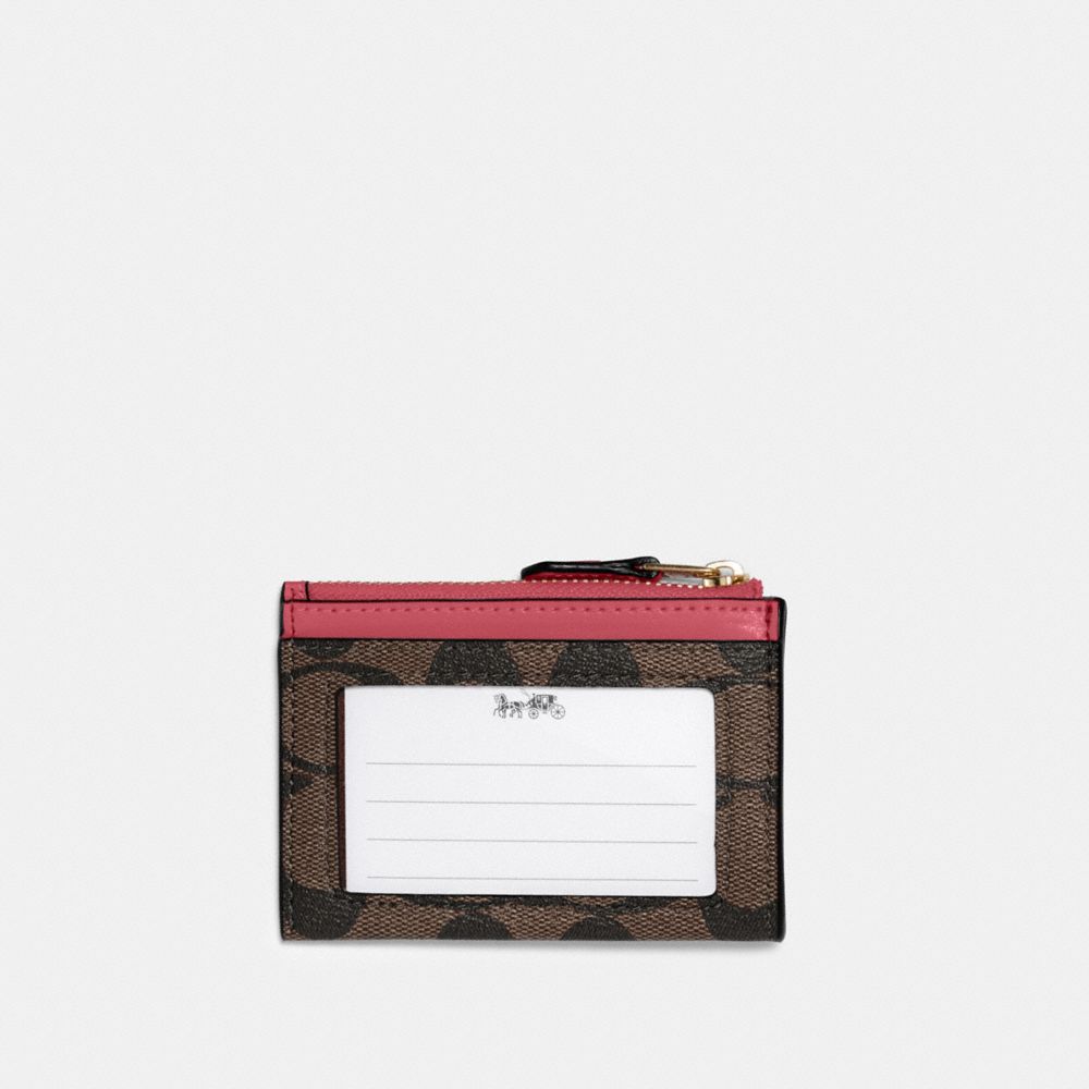 Signature coated canvas and smooth leather| Two credit card slots| ID window| Zip-top closure, fabric lining| Attached split key ring| 4 1/4" (L) x 3" (H) x 1/2" (W)Style No. 88208
