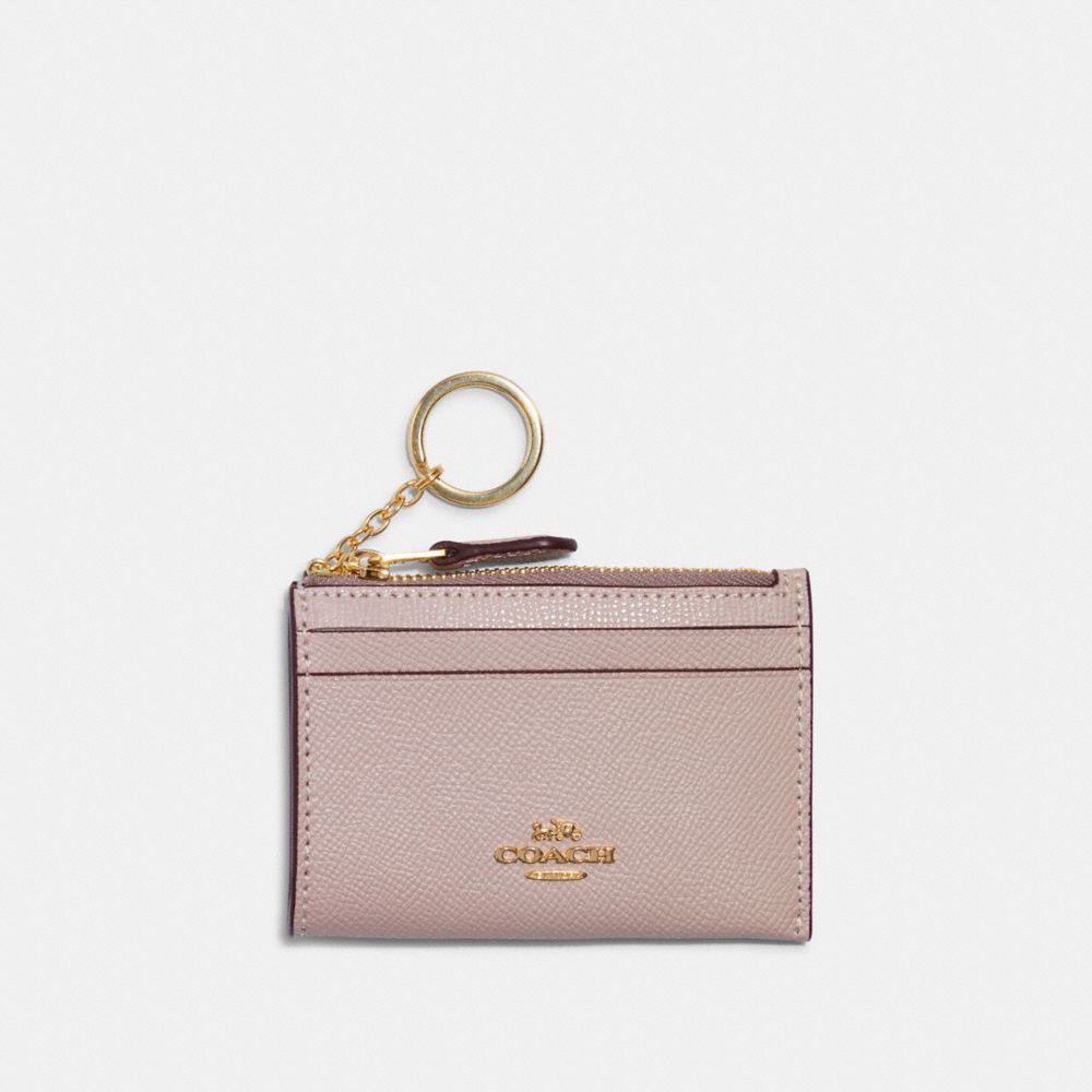 Crossgrain leather| Two credit card slots| ID window| Zip-top closure, fabric lining| Attached split key ring| 4 1/4" (L) x 3" (H) x 1/2" (W)Style No. 88250