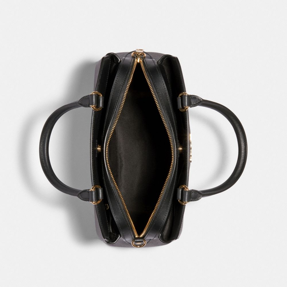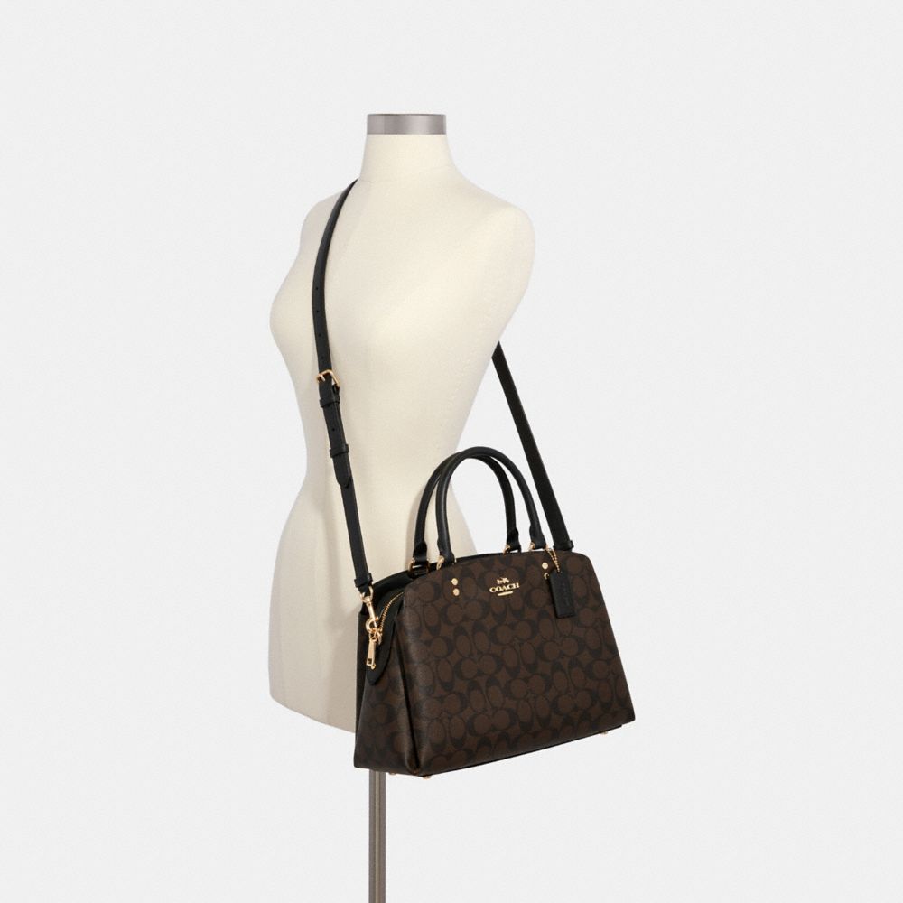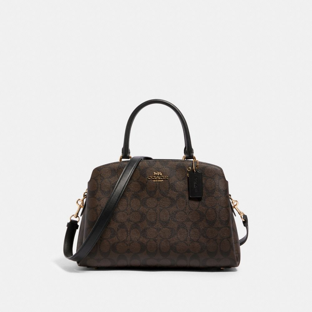 Signature coated canvas with smooth leather details| Inside zip and multifunction pockets| Center zip compartment| Snap closure, fabric lining| Handles with 4 3/4" drop| Outside open pocket| Detachable strap with 20" drop for shoulder or crossbody wear| 12 3/4" (L) x 8 3/4" (H) x 5 1/4" (W)