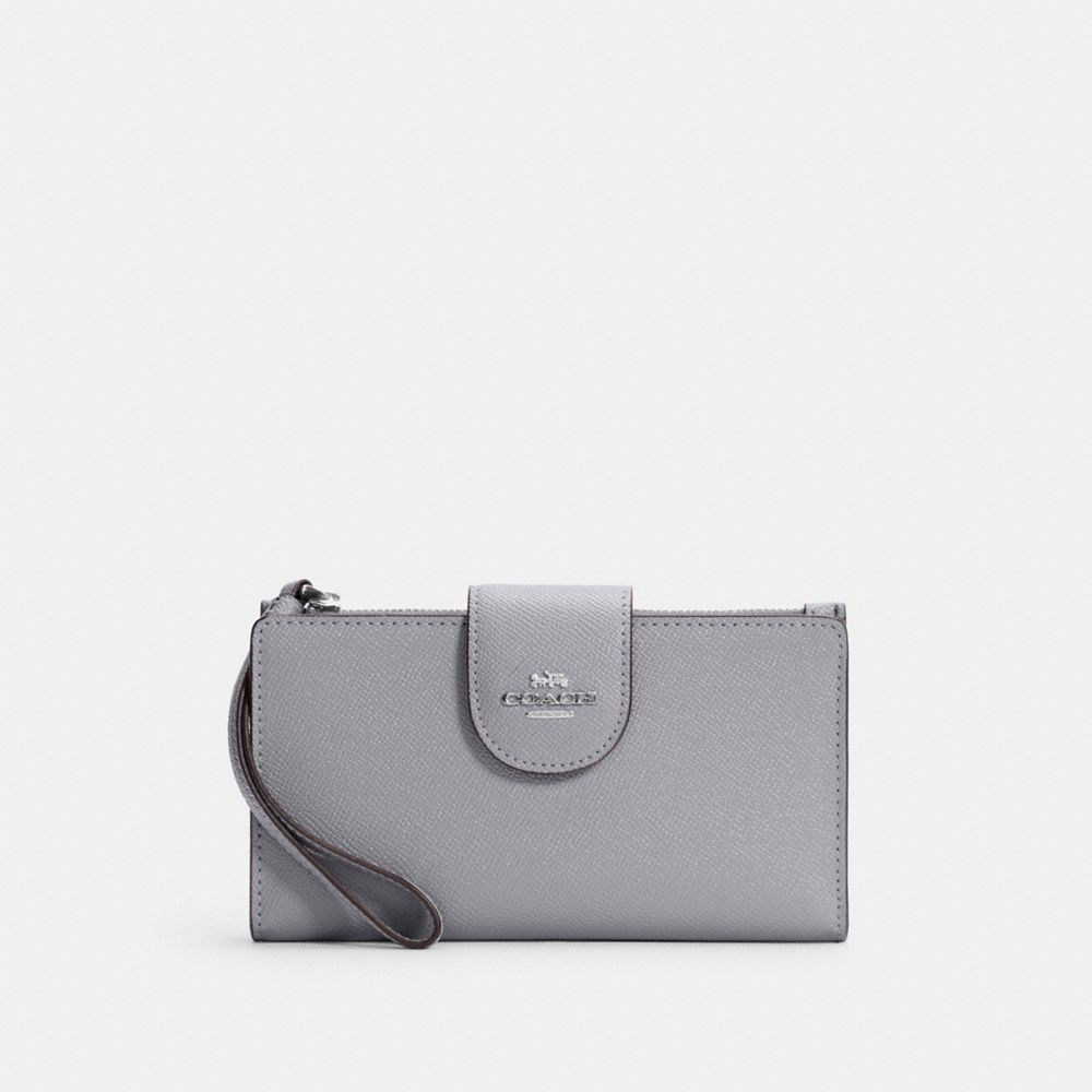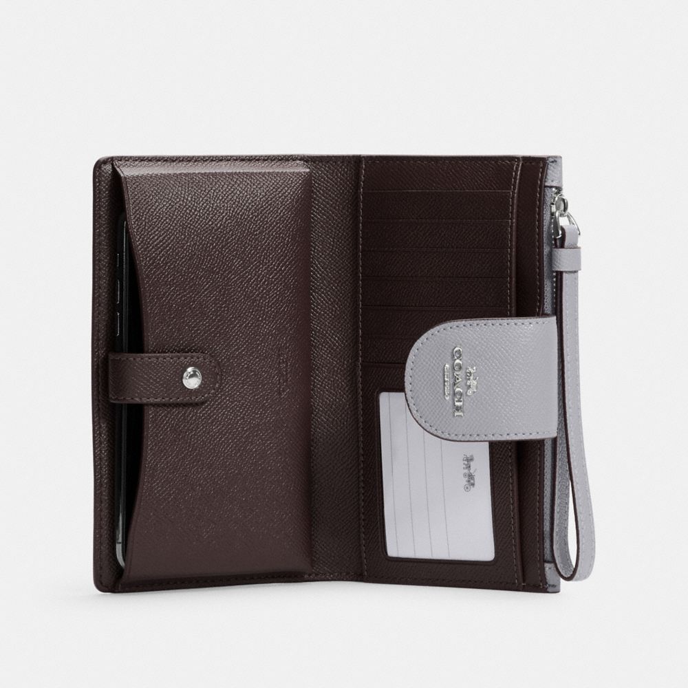 Crossgrain leather| Six credit card slots| ID window| Snap phone compartment| Snap closure| Outside zip pocket| Attached wrist strap| 7 1/4" (L) x 4 1/2" (H)| Fits all iPhone and Samsung Galaxy phones