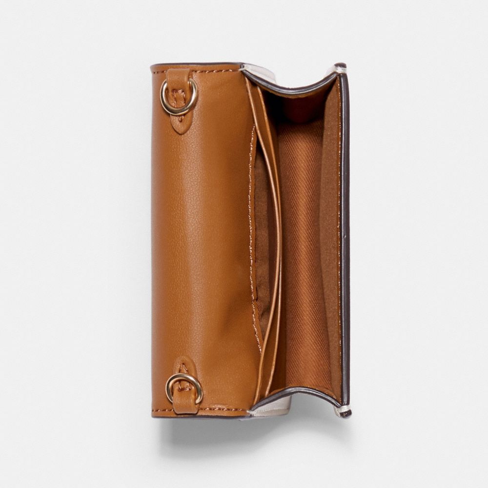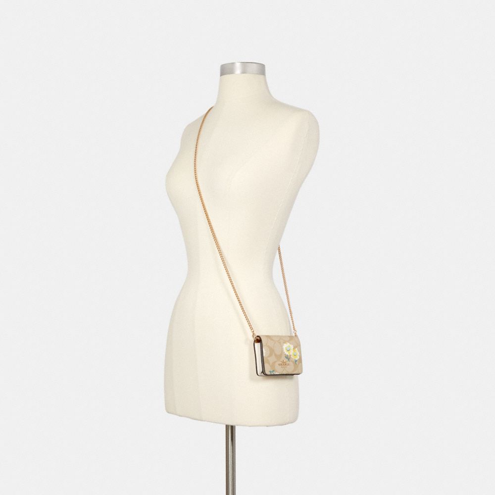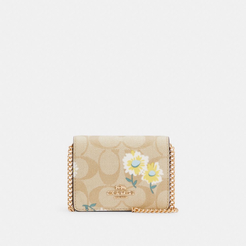 Signature coated canvas and smooth leather| Two credit card slots| Snap closure, fabric lining| Outside open pocket| Detachable chain strap with 23 1/4" drop for shoulder or crossbody wear| 4" (L) x 3" (H) x 1" (W)