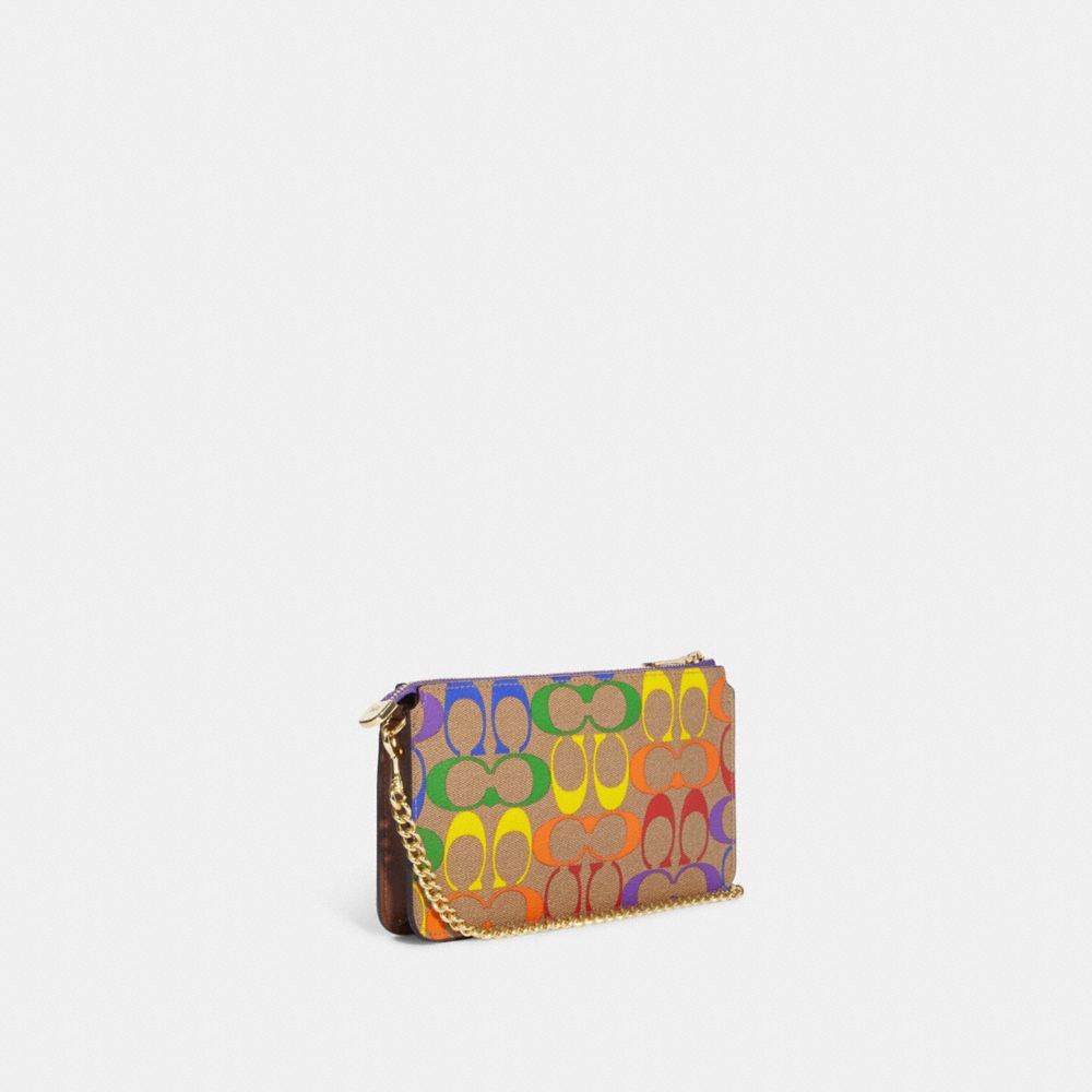 Crossbody pouch and detachable card case| Crossbody pouch:| Signature coated canvas and smooth leather| Two credit card slots| Zip-top closure, fabric lining| Outside snap pocket| Chain strap with 22" drop for shoulder or crossbody wear (17" drop with card case detached)| 8 1/4" (L) x 4 3/4" (H) x 1 1/4" (W)| Detachable card case:| Signature coated canvas and smooth leather| Inside multifunction pocket| Snap closure, fabric lining| Outside open pocket| Chain strap with 3" drop| 4" (L) x 3" (H) x 1" (W)| The Coach Foundation continues to partner with the Hetrick-Martin Institute, Point Foundation and CenterLink Community of LGBTQ Centers to create supportive environments where LGBTQIA+ young people can thrive. To learn more, visit coach.com/DreamItReal.Style No. C4697