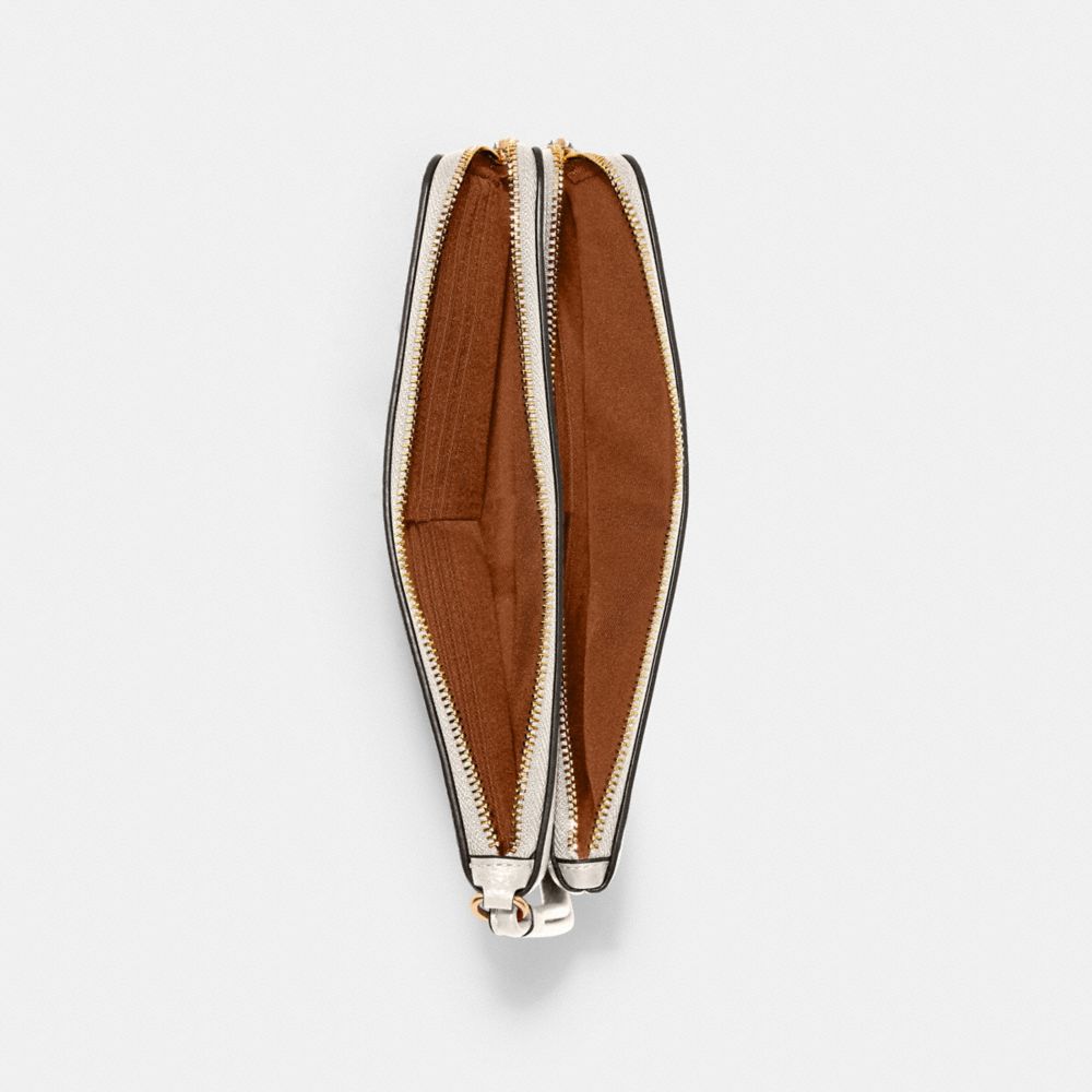 Refined pebble leather| Six credit card slots| Full-length bill compartment| Inside open pockets| Double zip closure, fabric lining| Wrist strap attached| 8" (L) x 4 3/4" (H) x 1 1/4" (W)| Fits all phone sizes up to an iPhone X and Samsung S7 Edge