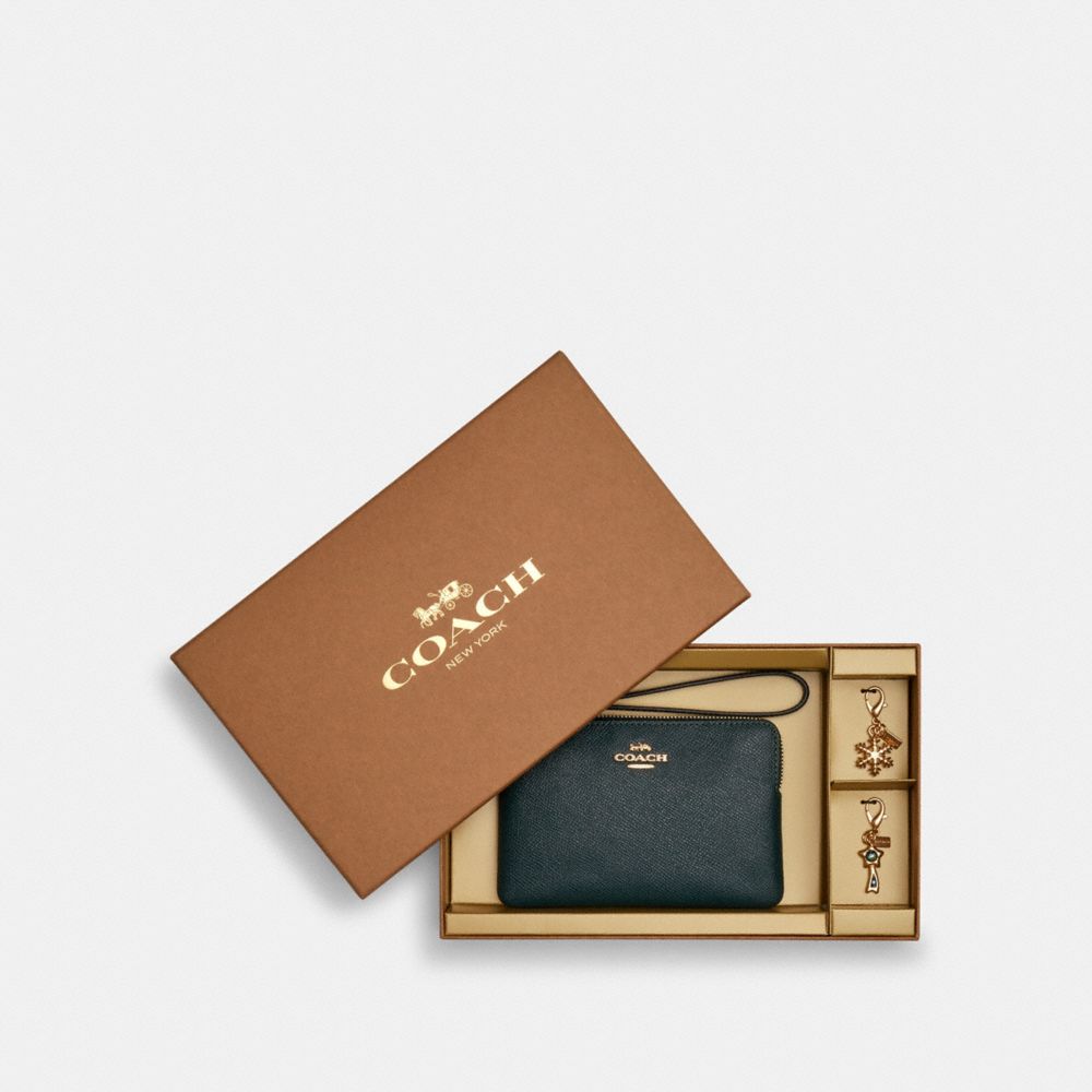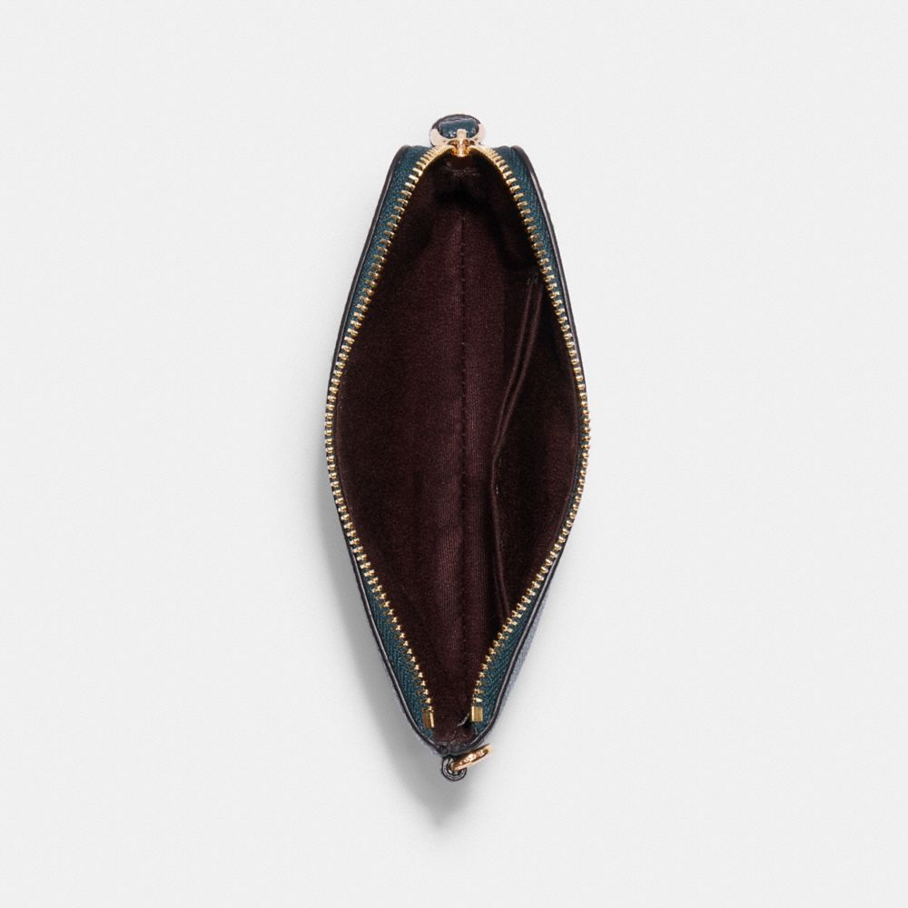 Crossgrain leather| Two credit card slots| Zip-top closure, fabric lining| Wrist strap attached| 6 1/4" (L) x 4" (H) x 1/2" (W)| Includes removable charms| Packaged in a Coach gift boxStyle No. C6878