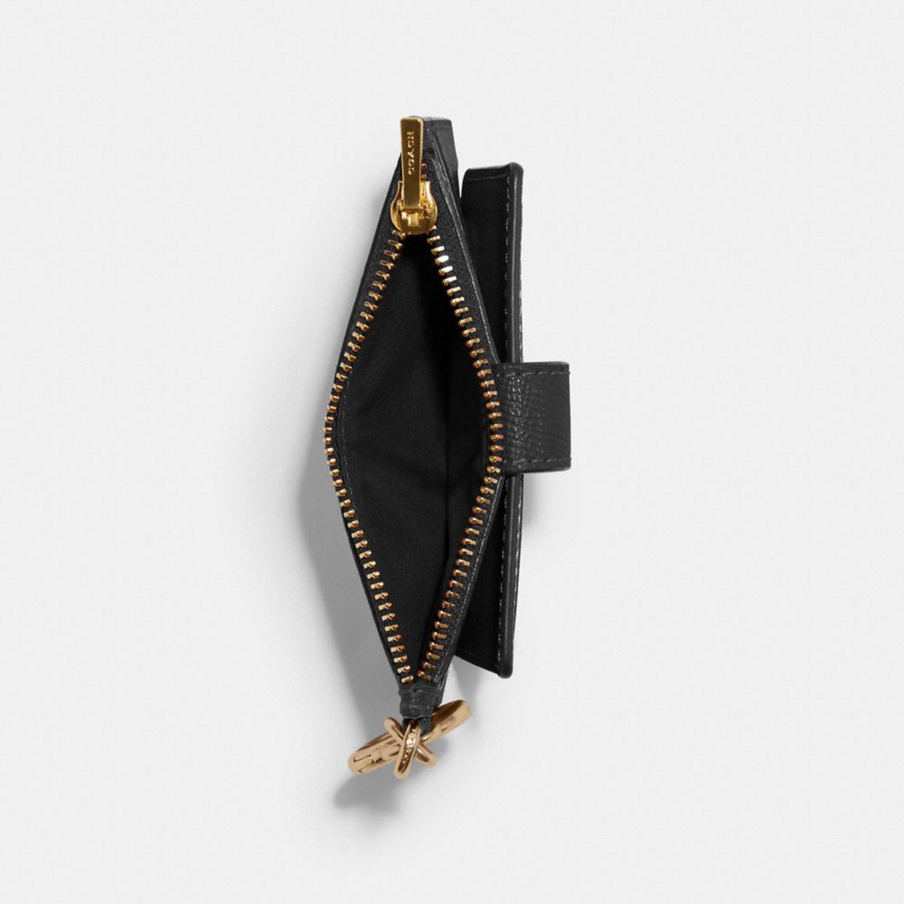 Crossgrain leather| Three credit card slots| ID window| Snap closure| Zip compartment| Attached hinged key ring| 4 3/4" (L) x 3" (H)Style No. C6881
