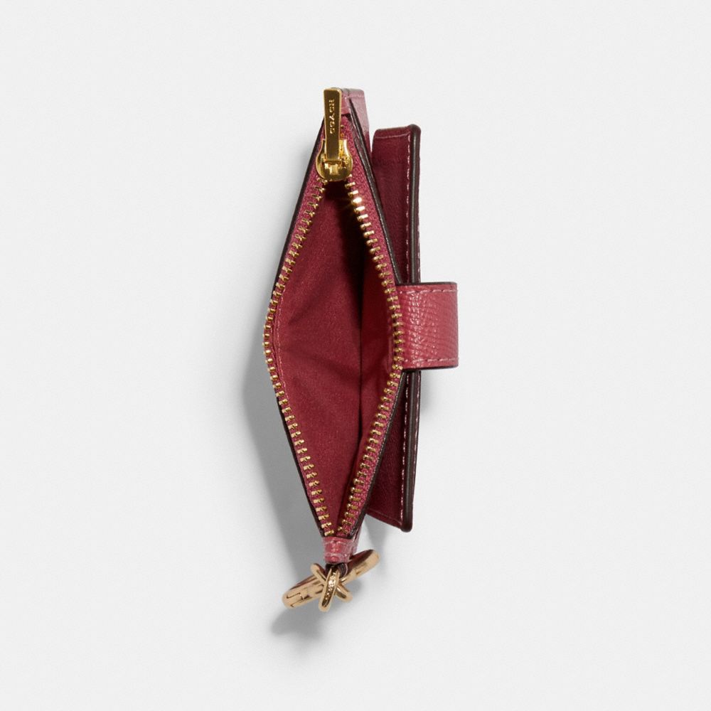 Crossgrain leather| Three credit card slots| ID window| Snap closure| Zip compartment| Attached hinged key ring| 4 3/4" (L) x 3" (H)Style No. C6881