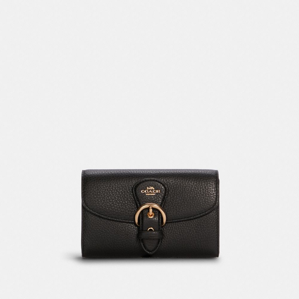 Refined pebble leather| Four credit card slots| Inside open pockets| Inside zip coin pocket| Snap closure| Outside open pocket| 6" (L) x 3 3/4" (H) x 3/4" (W)Style No. C6896
