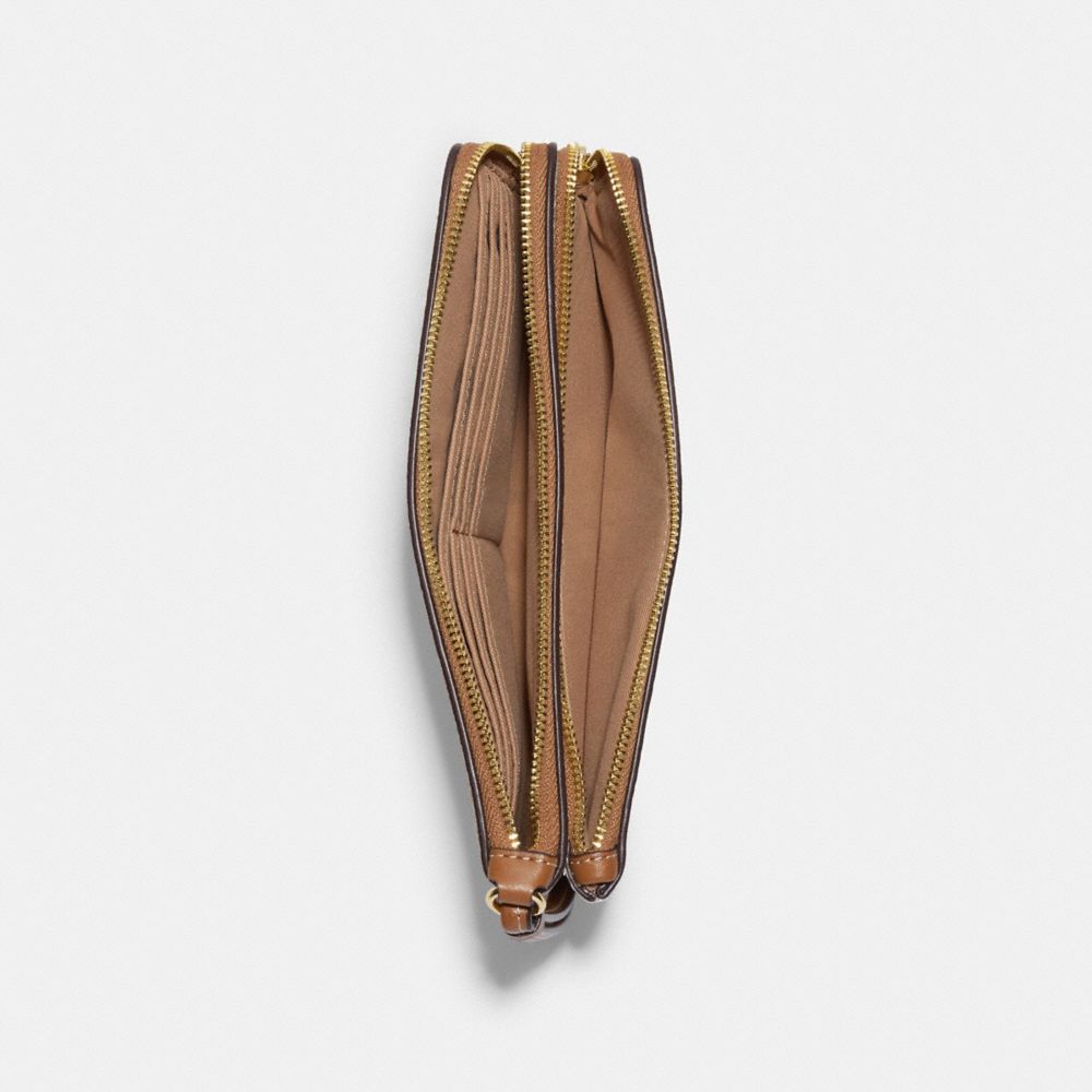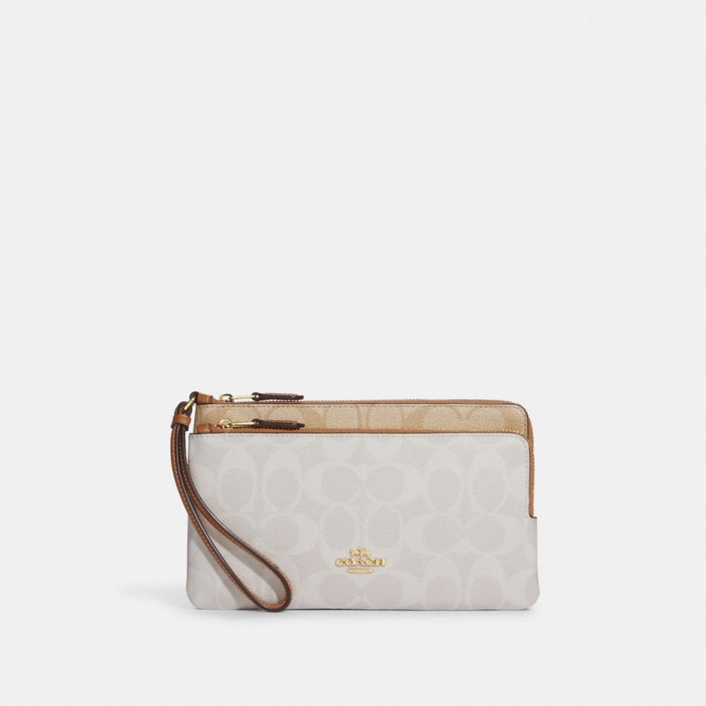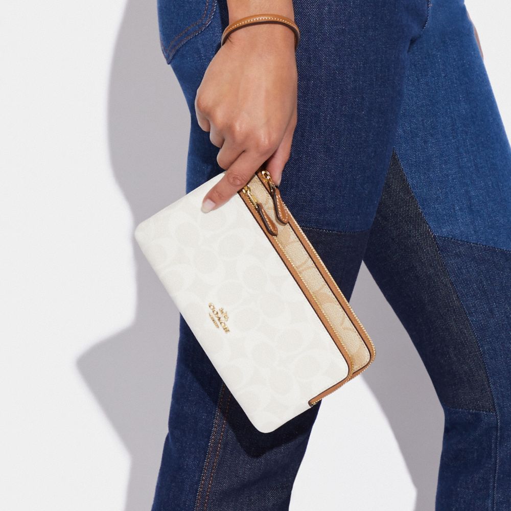 Signature coated canvas and smooth leather| Eight credit card slots| Inside open pockets| Double zip closure, fabric lining| Wrist strap attached| 8" (L) x 4 3/4" (H) x 1" (W)| Fits all phone sizes up to an iPhone X and Samsung S7 EdgeStyle No. C7313