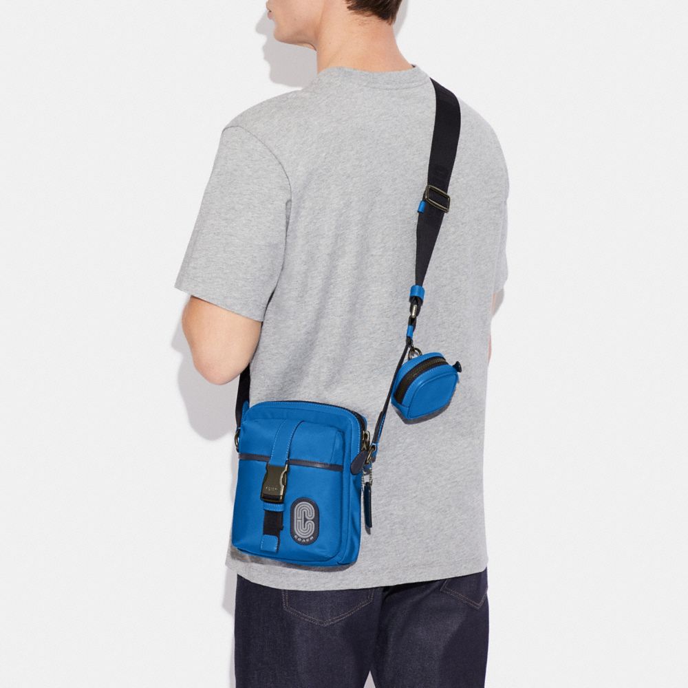 Nylon and natural smooth calf leather| Crossbody pouch:| Three credit card slots| Inside multifunction pockets| Zip closure, fabric lining| Outside open and speedclip closure pockets| Adjustable strap with 25" drop for shoulder or crossbody wear| 7" (L) x 8 1/4" (H) x 1 3/4" (W)| Removable square pouch:| Zip closure, fabric lining| Attached hinged key ring| 2 3/4" (L) x 2 3/4" (H) x 1 1/4" (W)Style No. C9836