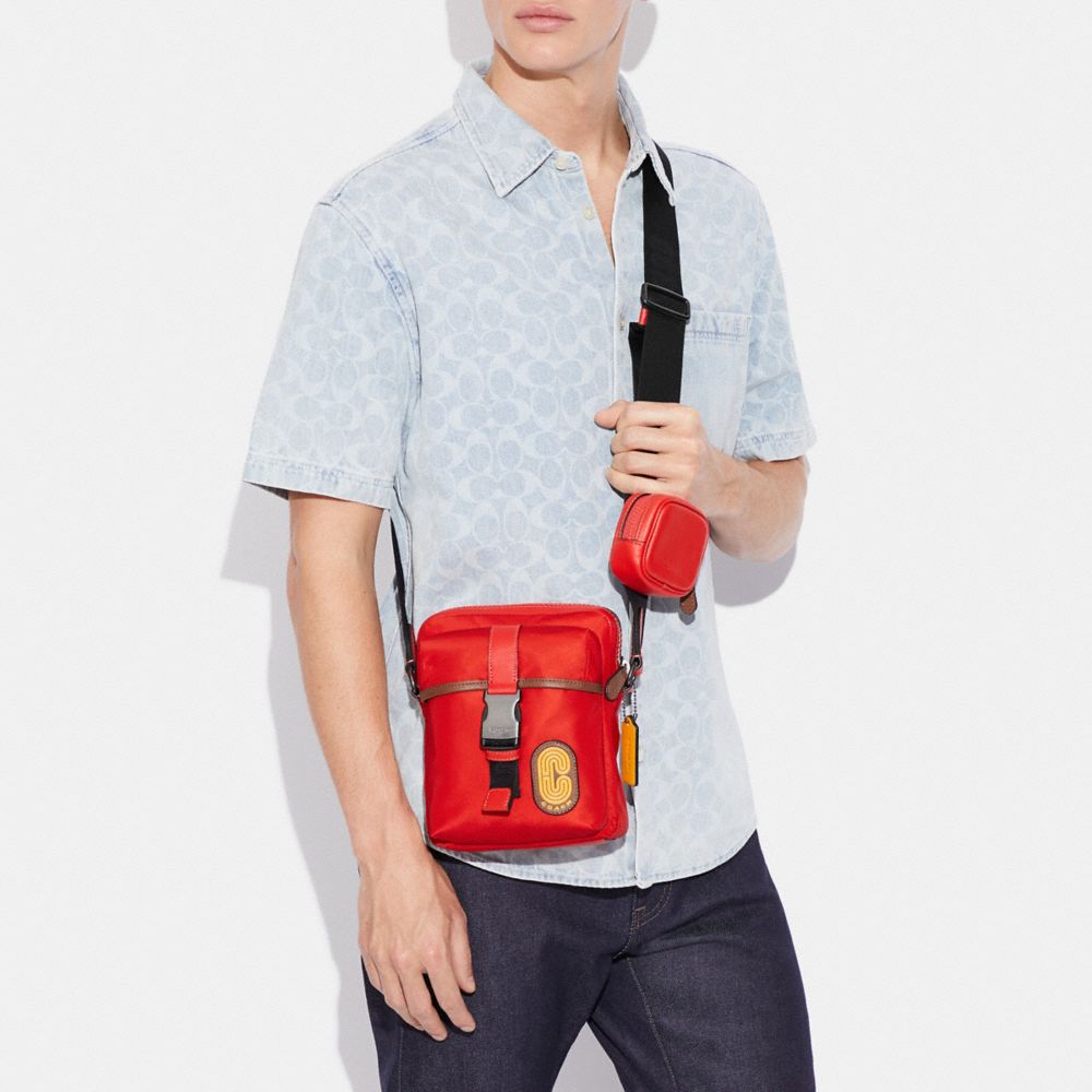 Nylon and natural smooth calf leather| Crossbody pouch:| Three credit card slots| Inside multifunction pockets| Zip closure, fabric lining| Outside open and speedclip closure pockets| Adjustable strap with 25" drop for shoulder or crossbody wear| 7" (L) x 8 1/4" (H) x 1 3/4" (W)| Removable square pouch:| Zip closure, fabric lining| Attached hinged key ring| 2 3/4" (L) x 2 3/4" (H) x 1 1/4" (W)Style No. C9836