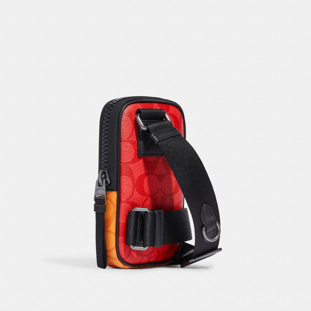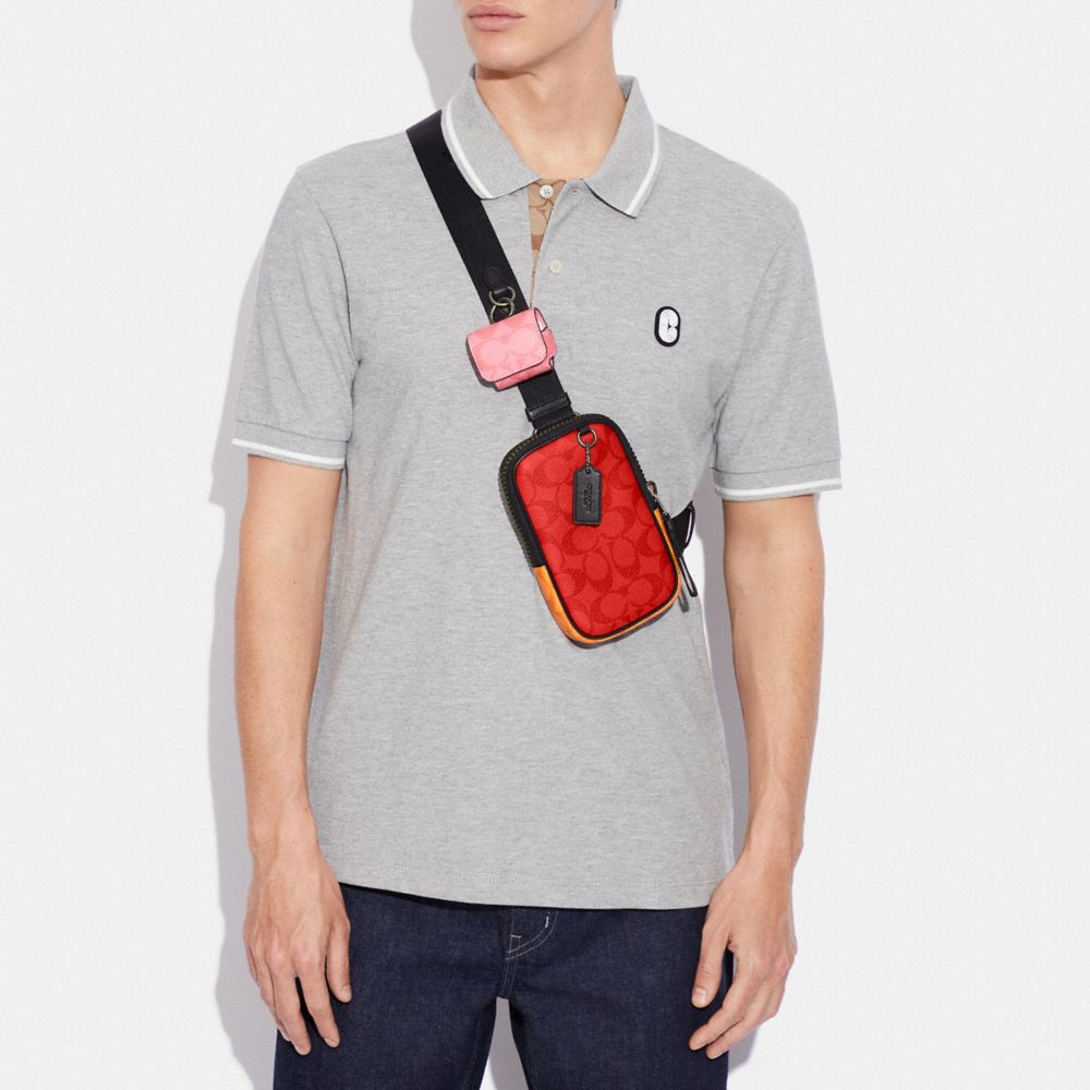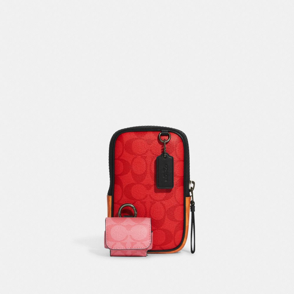 Signature coated canvas and smooth calf leather| Phone pack:| Zip closure, fabric lining| Adjustable strap with 22" drop for shoulder or crossbody wear| 4" (L) x 6 3/4" (H) x 1" (W)| Detachable earbud case:| Snap closure| Attached dogleash clip| 2 1/4" (L) x 2 1/4" (H) x 3/4" (W)Style No. C9842
