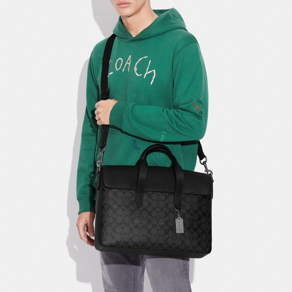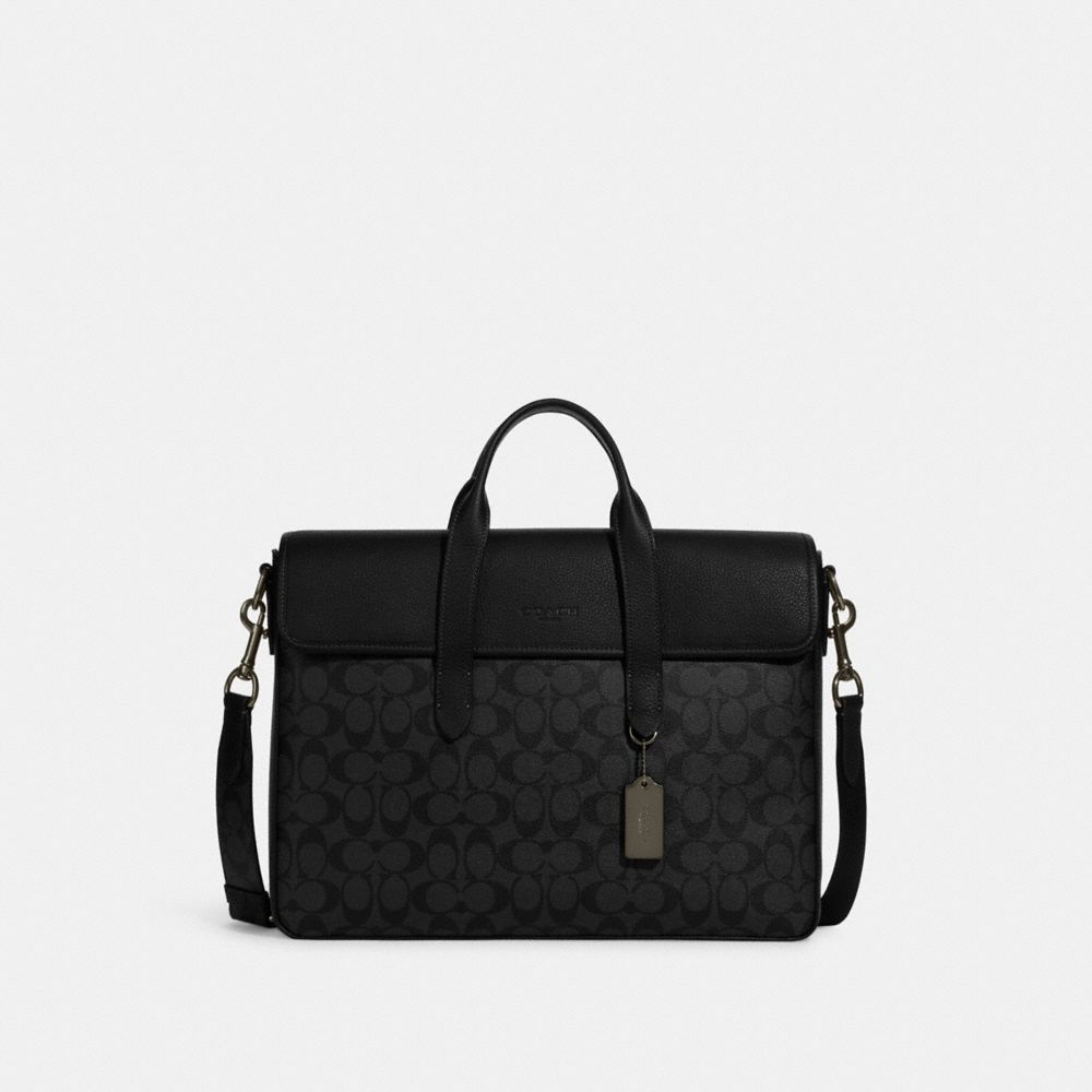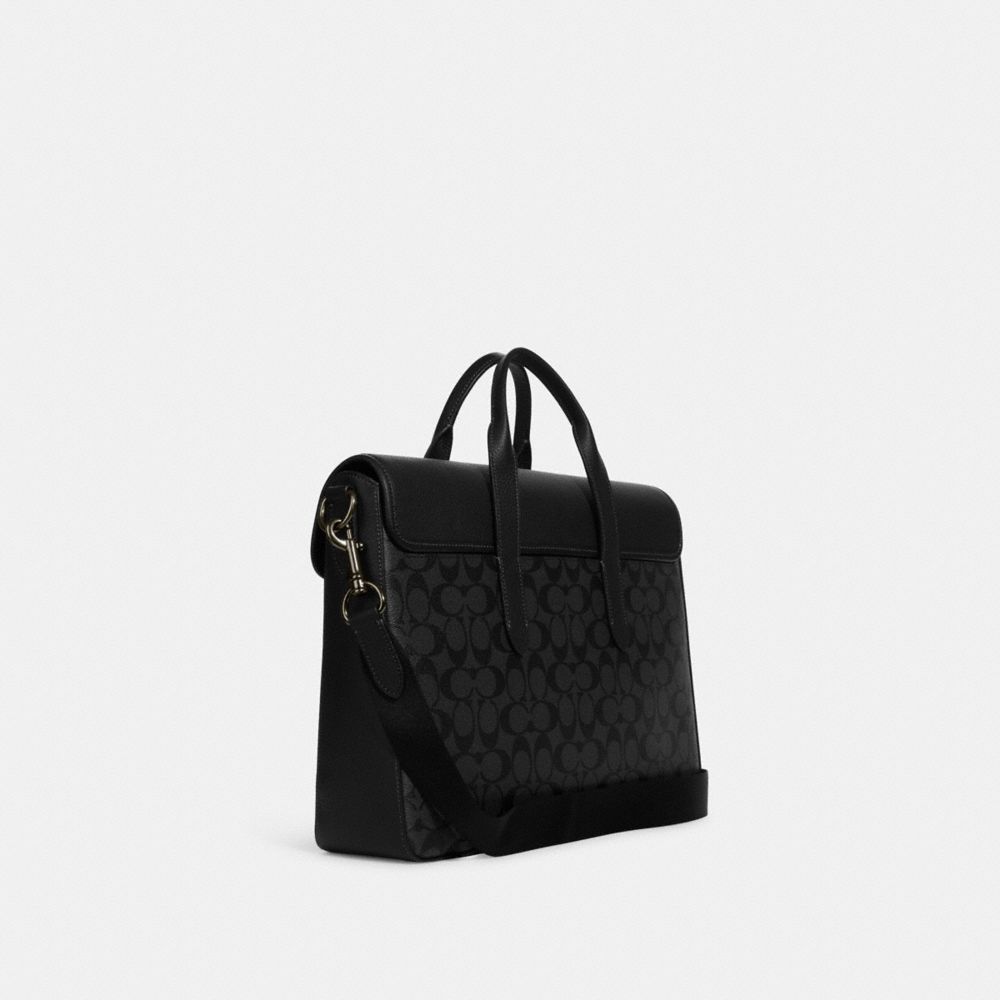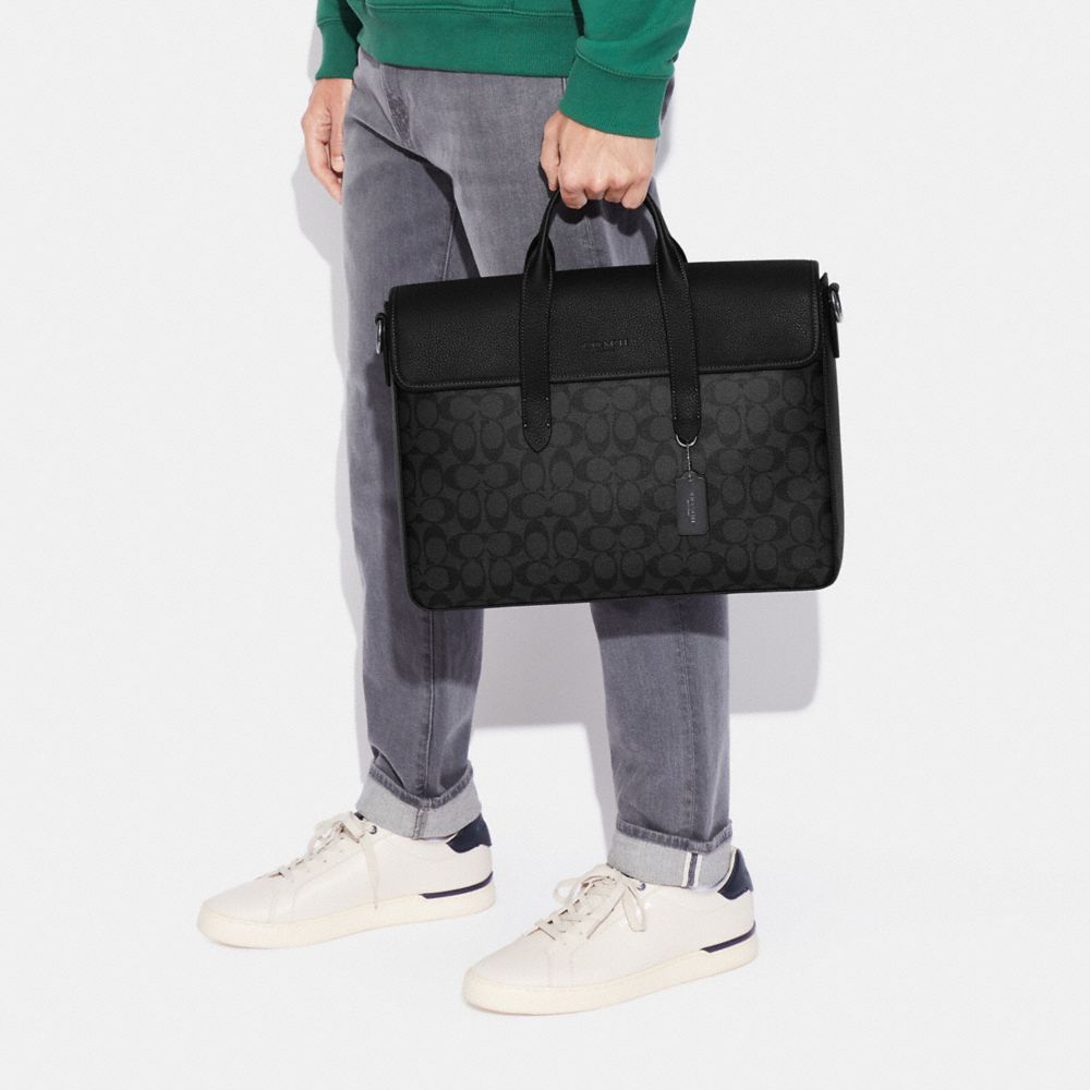 Signature coated canvas and refined pebble leather| Inside zip and multifunction pockets| Inside laptop sleeve with secure tab| Magnetic snap closure, fabric lining| Handles with 4 3/4" drop| Outside magnetic snap pocket| Detachable strap with 25" drop for shoulder or crossbody wear| 15 1/4" (L) x 11" (H) x 3 3/4" (W)Style No. C9873