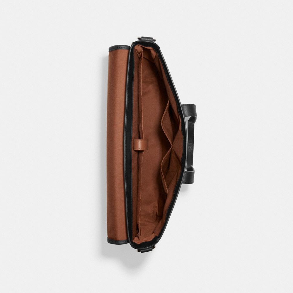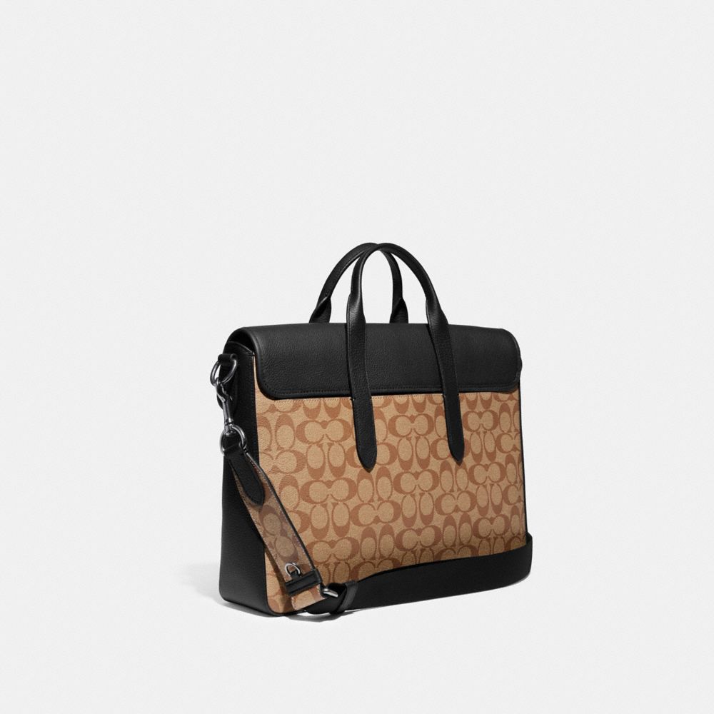 Signature coated canvas and refined pebble leather| Inside zip and multifunction pockets| Inside laptop sleeve with secure tab| Magnetic snap closure, fabric lining| Handles with 4 3/4" drop| Outside magnetic snap pocket| Detachable strap with 25" drop for shoulder or crossbody wear| 15 1/4" (L) x 11" (H) x 3 3/4" (W)Style No. C9873