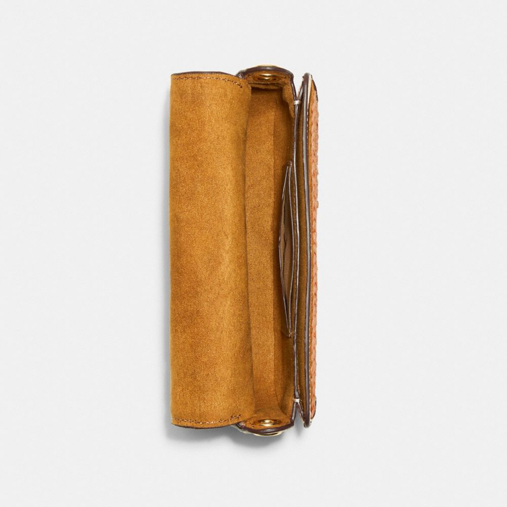 Paper straw and smooth leather| Two credit card slots| Inside multifunction pocket| Snap closure, fabric lining| Outside open pocket| Detachable wrist strap| Detachable chain strap with 23" drop for shoulder or crossbody wear| 7 1/2" (L) x 4 1/2" (H) x 1 3/4" (W)Style No. C9925