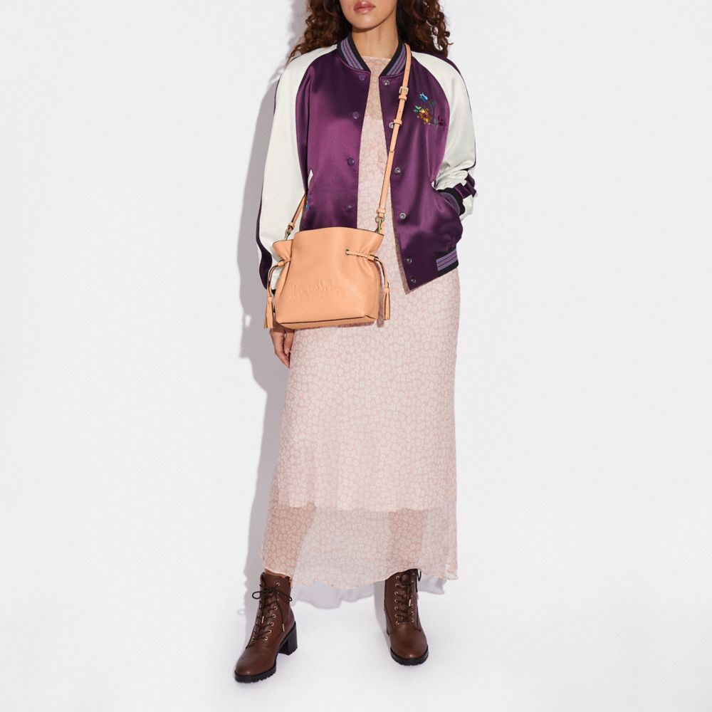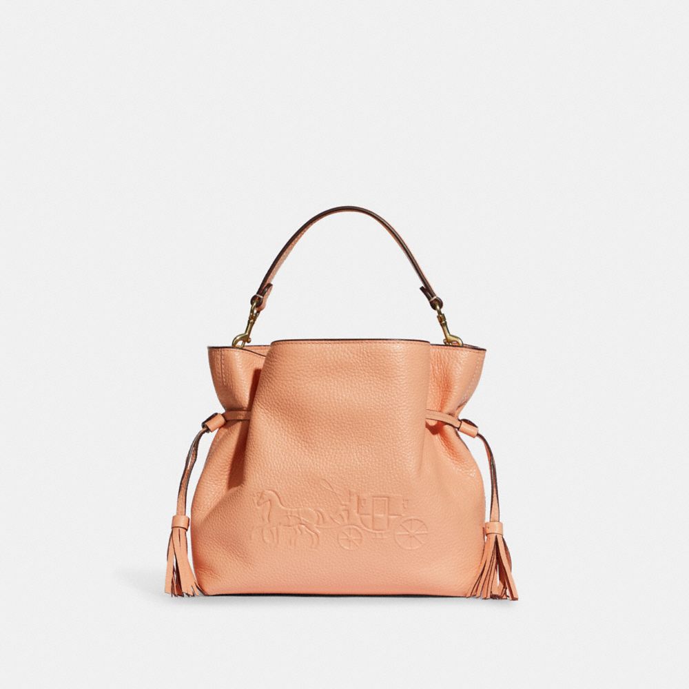 Refined pebble leather| Inside zip and multifunction pockets| Drawstring and magnetic snap closures, fabric lining| Detachable handle with 5 1/4" drop| Detachable strap with 21" drop for shoulder or crossbody wear| 9 1/2" (L) x 7 3/4" (H) x 3 3/4" (W)Style No. CA213