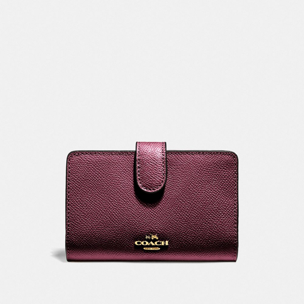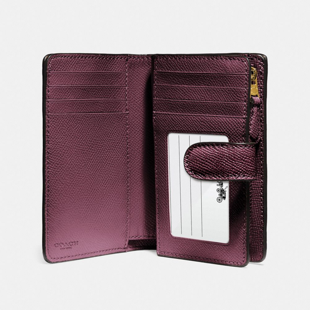 Crossgrain leather| Seven credit card slots| Bill compartment| ID window| Zip pocket| Snap closure| 5" (L) x 3 1/2" (H) x 1/2" (W)