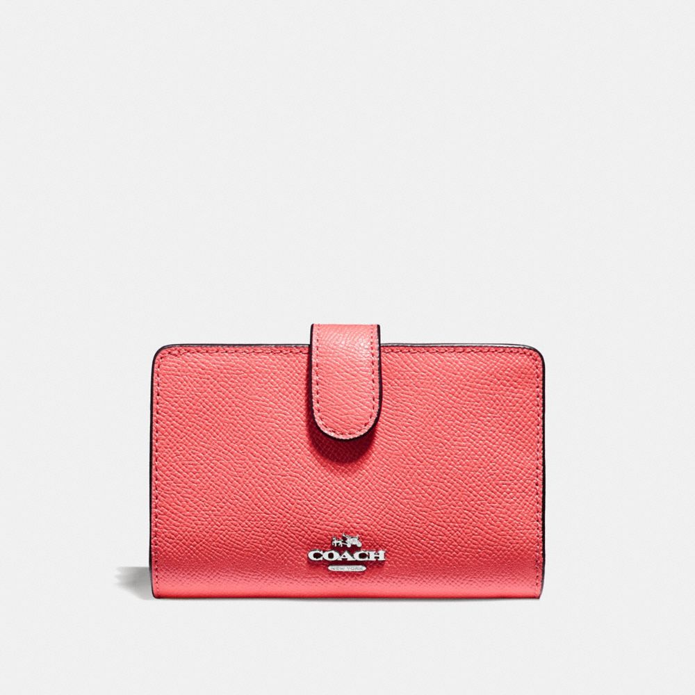 | Crossgrain leather| Six credit card slots| Bill compartment| ID window| Zip pocket| Snap closure| 5" (L) x 3 1/2" (H) x 1/2" (W)
