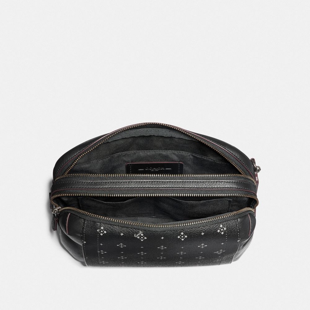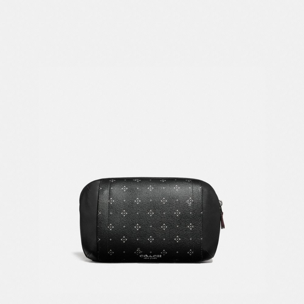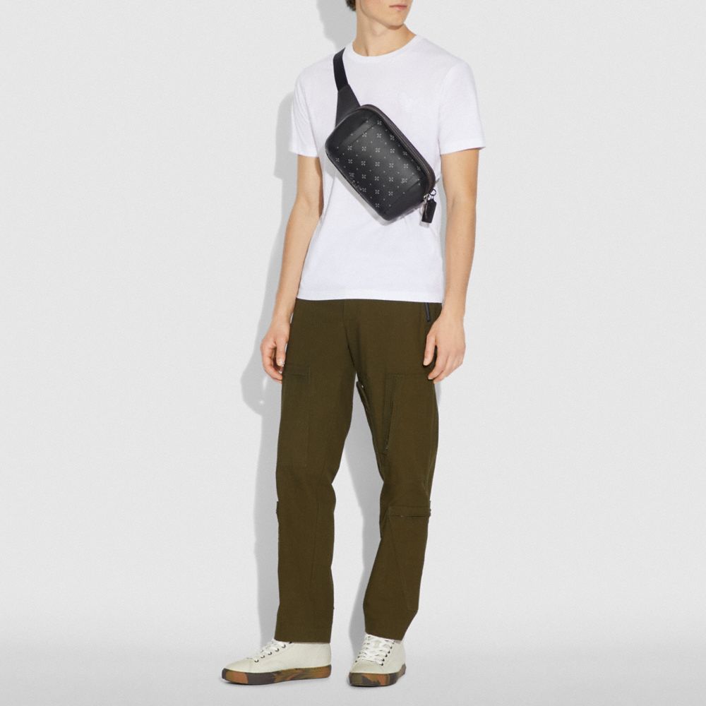 Printed coated canvas and smooth calf leather| Inside cell phone and multifunction pockets| Double zip closure, fabric lining| Outside zip pocket| Adjustable strap for wear at waist| 11" (L) x 10 3/4" (H) x 3 1/4" (W)