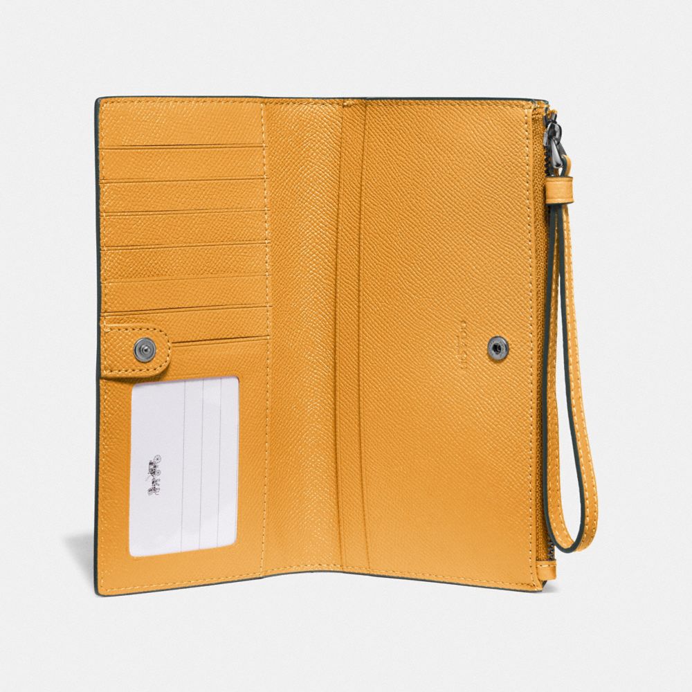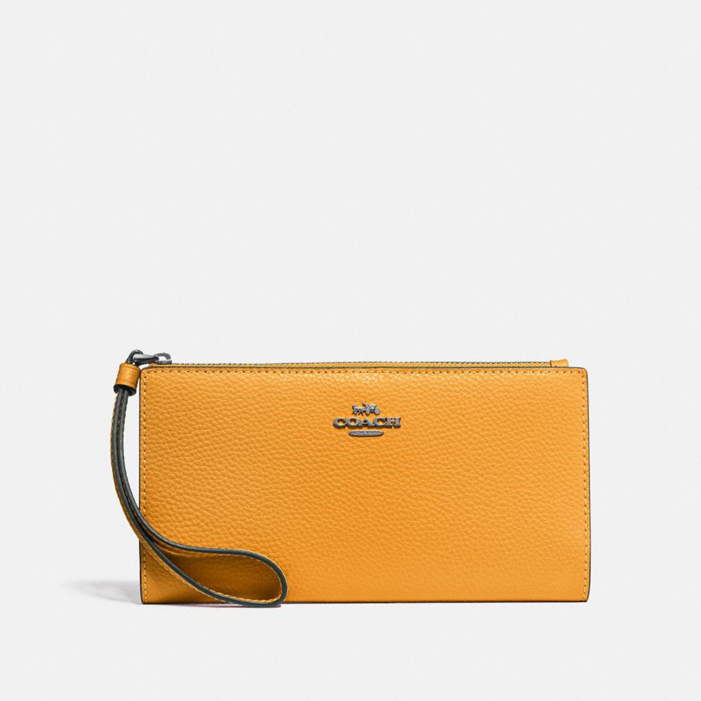 Polished pebble leather| Six credit card slots| ID window| Full-length bill compartments| Zip coin pocket| Snap closure| Wrist strap attached| 7 1/2" (L) x 4" (H) x 3/4" (W)