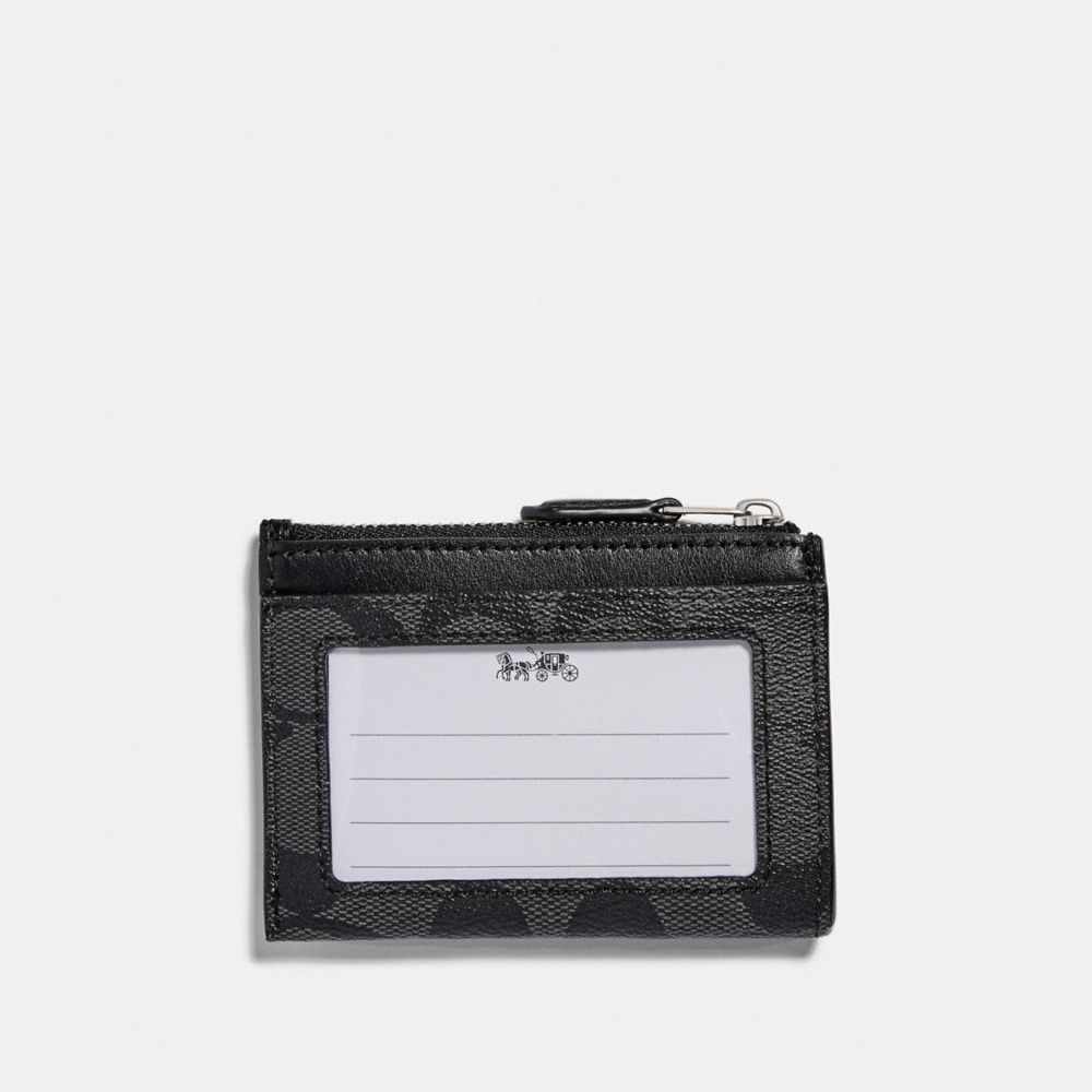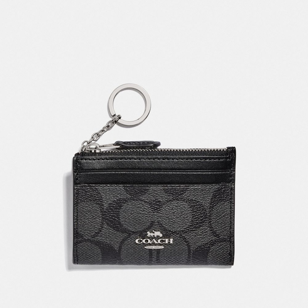 Signature coated canvas and smooth leather| Two credit card slots| ID window| Zip-top closure, fabric lining| Attached split key ring| 4 1/4" (L) x 3" (H) x 1/2" (W)