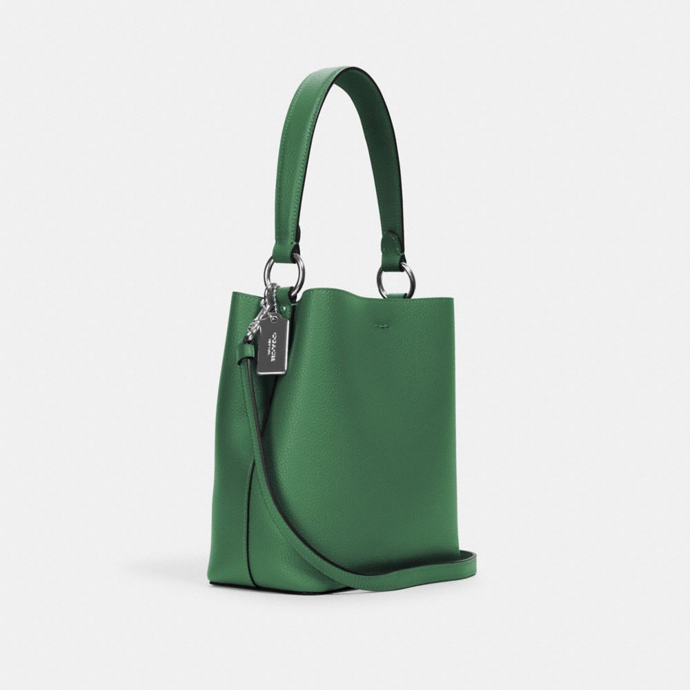 Polished pebble leather| Center zip compartment| Snap closure| Handle with 6 3/4" drop| Detachable strap with 22" drop for shoulder or crossbody wear| 8 1/2" (L) x 8 1/2" (H) x 4" (W)