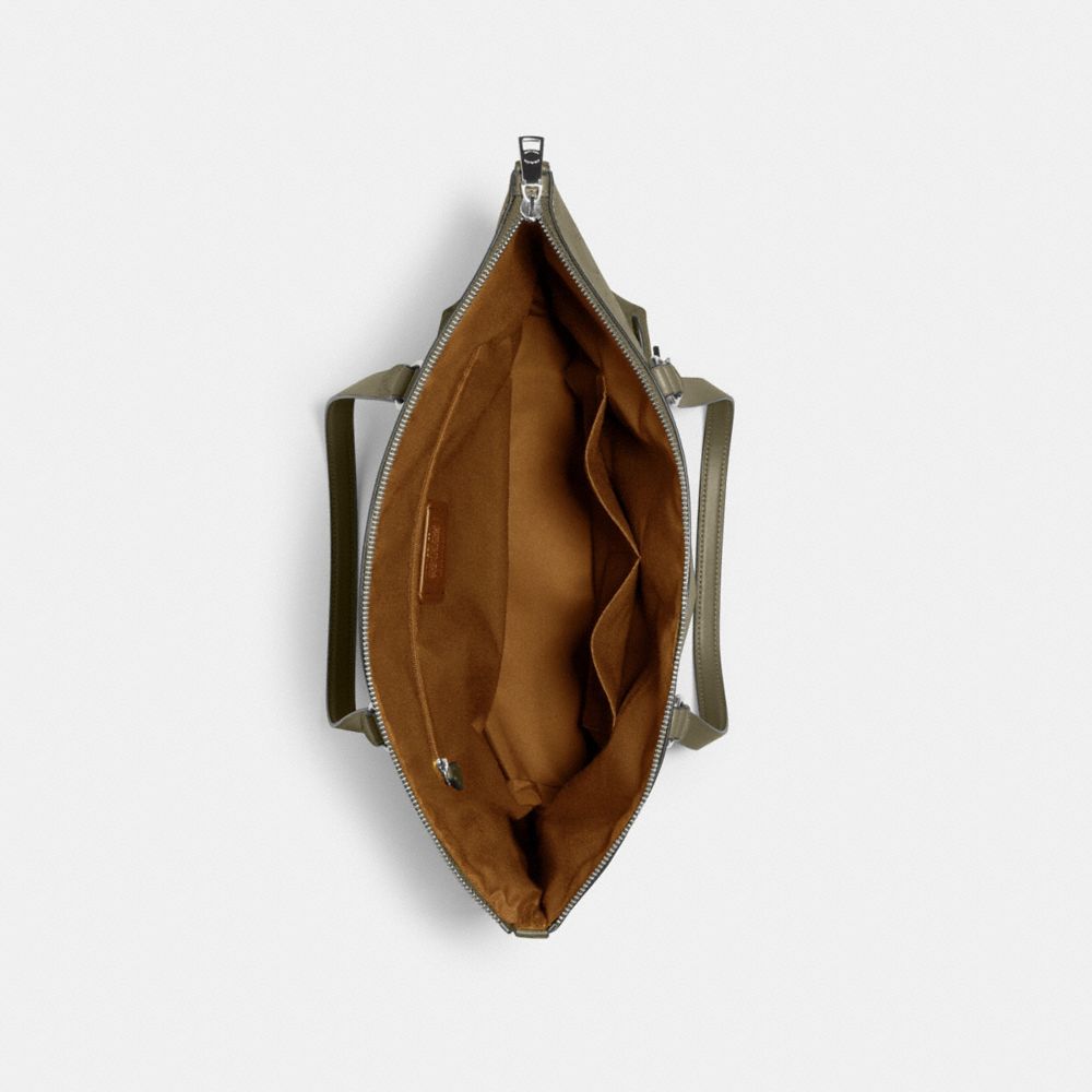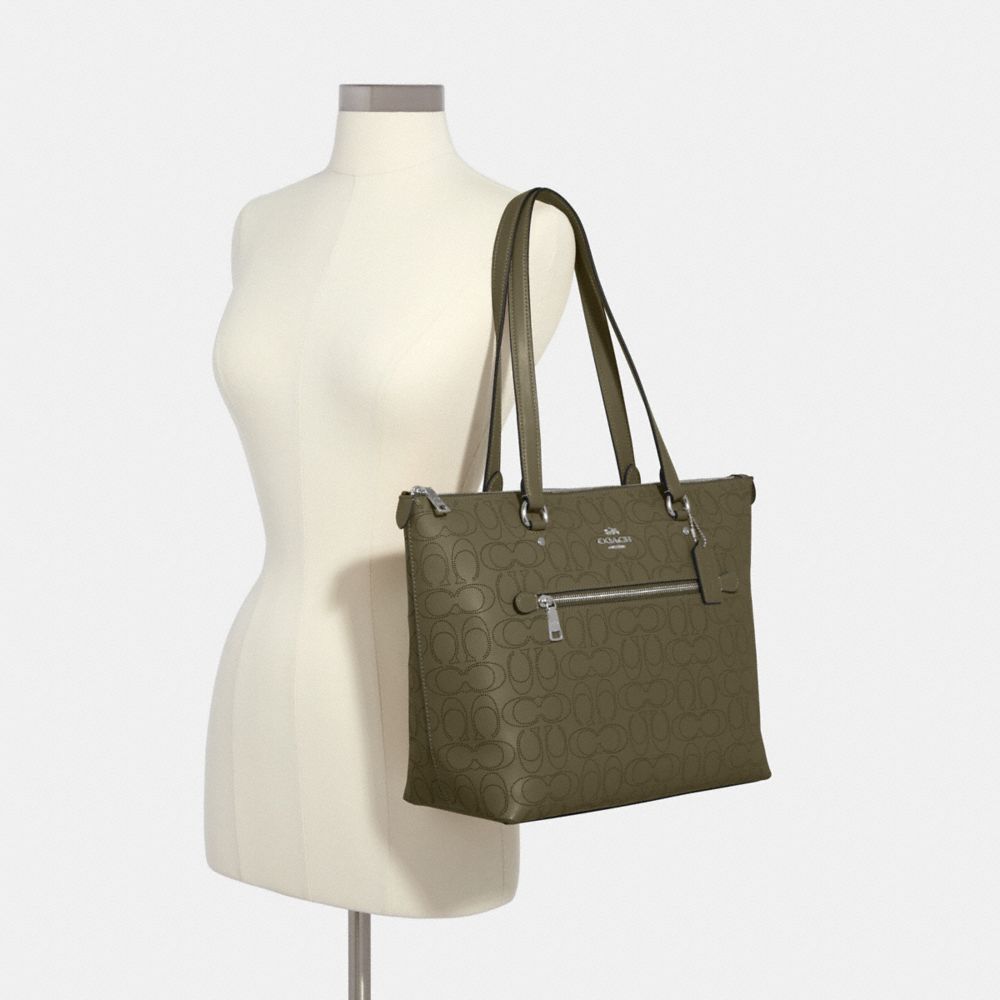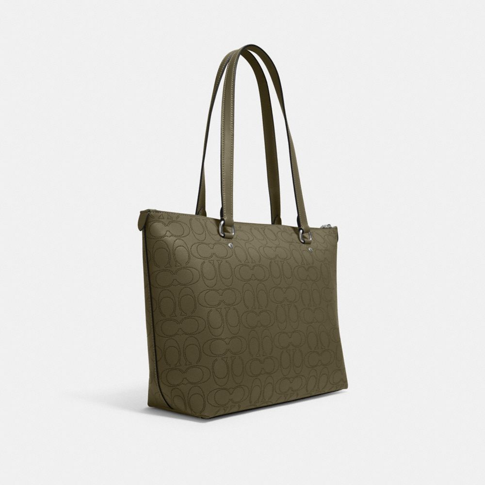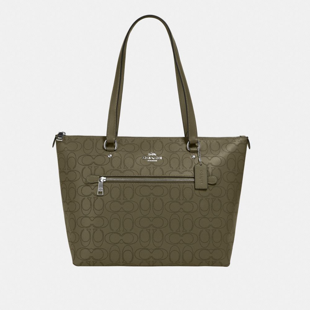 Signature perforated leather and smooth leather| Inside zip, cell phone and multifunction pockets| Zip-top closure, fabric lining| Handles with 10 1/4" drop| Outside zip pocket| 12 3/4" (L) x 10 1/2" (H) x 5 1/2" (W)