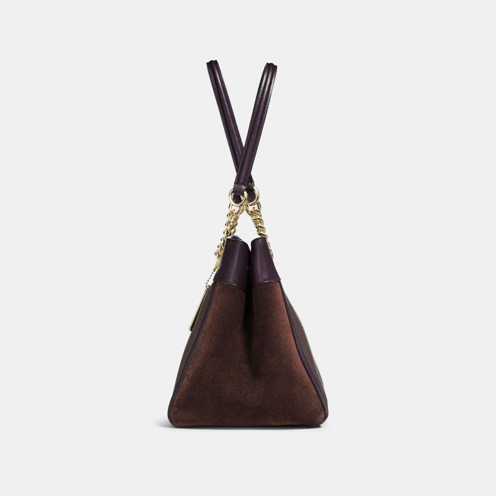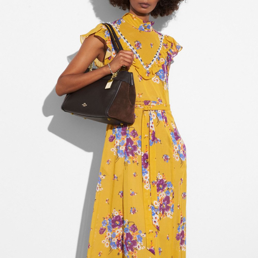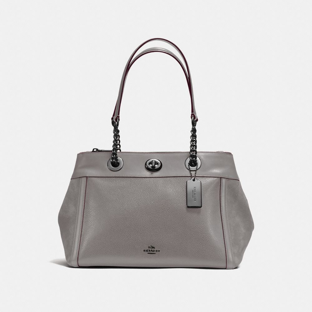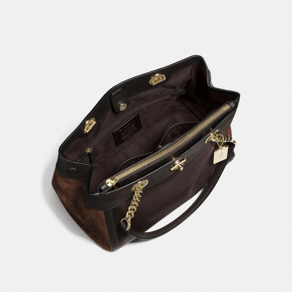 Smooth leather, polished pebble leather and suede| Inside zip, cell phone and multifunction pockets| Zip compartment| Snap closure, fabric lining| Handles with 8 1/4" drop | Outside turnlock pocket| 11 1/2" (L) x 8 3/4" (H) x 7" (W)