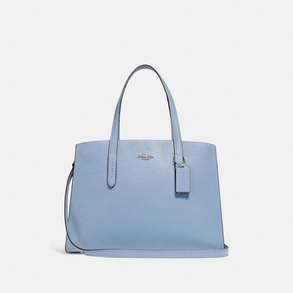 Polished pebble leather| Inside cell phone and multifunction pockets| Center zip compartment| Handles with 6 1/2" drop| Detachable strap with 19 1/2" drop for shoulder or crossbody wear| Fits a 13" laptop| 14" (L) x 9 1/2" (H) x 5 3/4" (W)