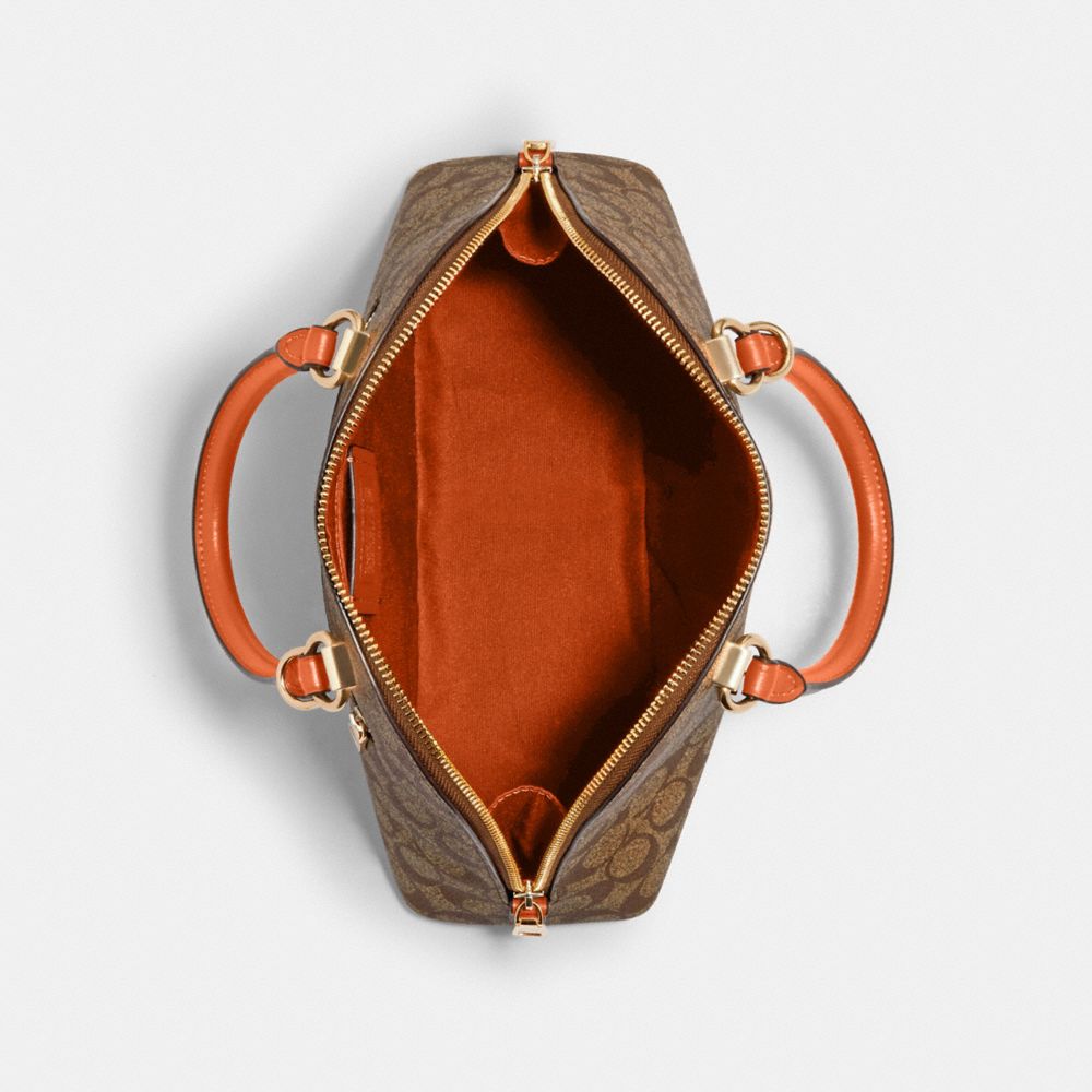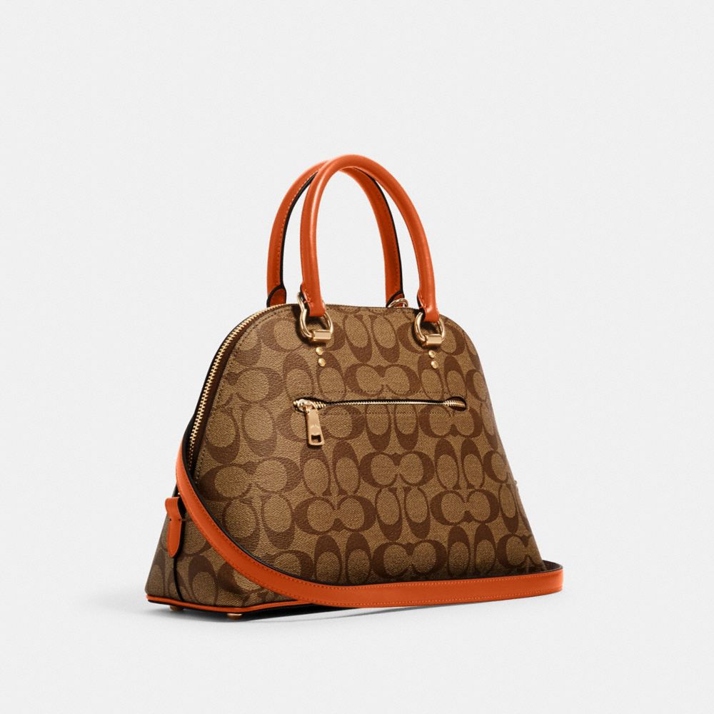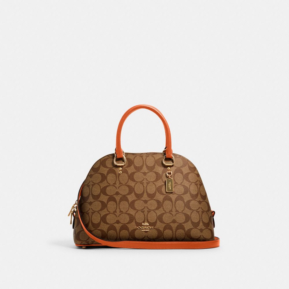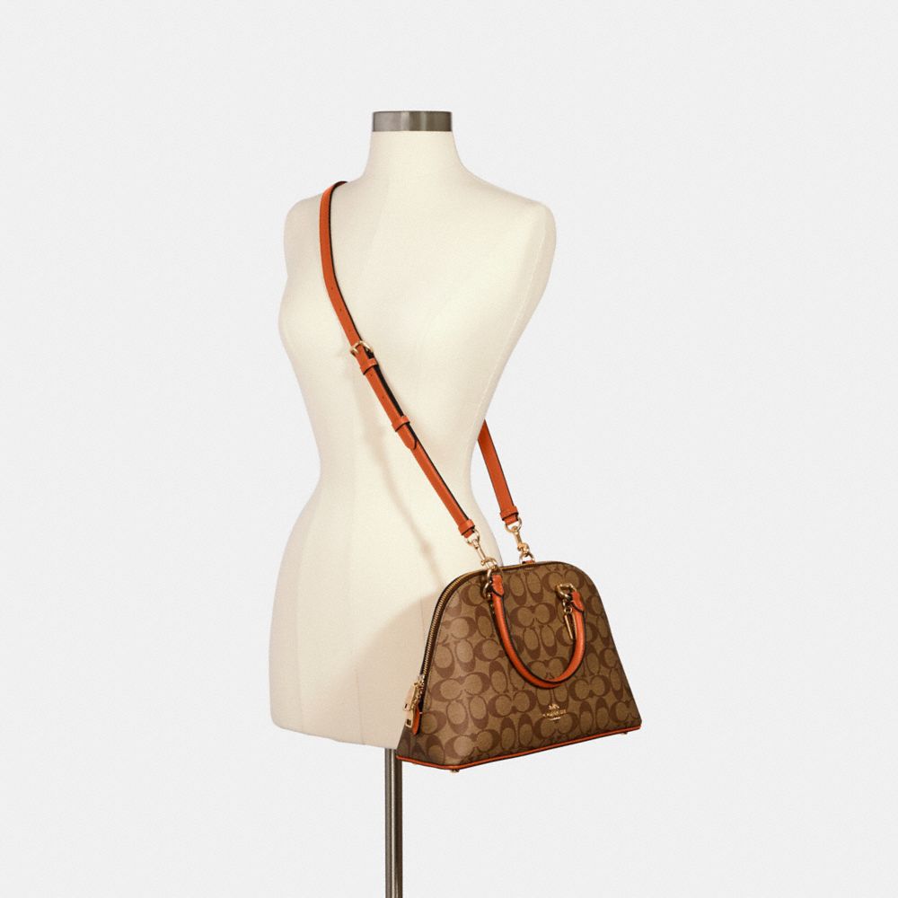 Signature coated canvas and smooth leather| Inside zip pocket| Zip closure, fabric lining| Handles with 3 3/4" drop| Outside zip pocket| Detachable strap with 22" drop for shoulder or crossbody wear| 11 3/4" (L) x 7 3/4" (H) x 4" (W)