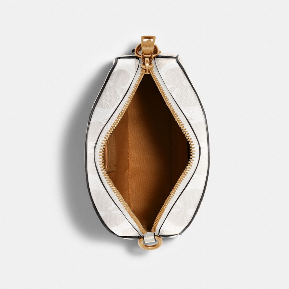 Signature coated canvas and smooth leather| Two credit card slots| Zip closure, fabric lining| Outside slip pocket| Detachable strap with 23" drop for shoulder or crossbody wear| 6 1/2" (L) x 4 3/4" (H) x 2" (W)