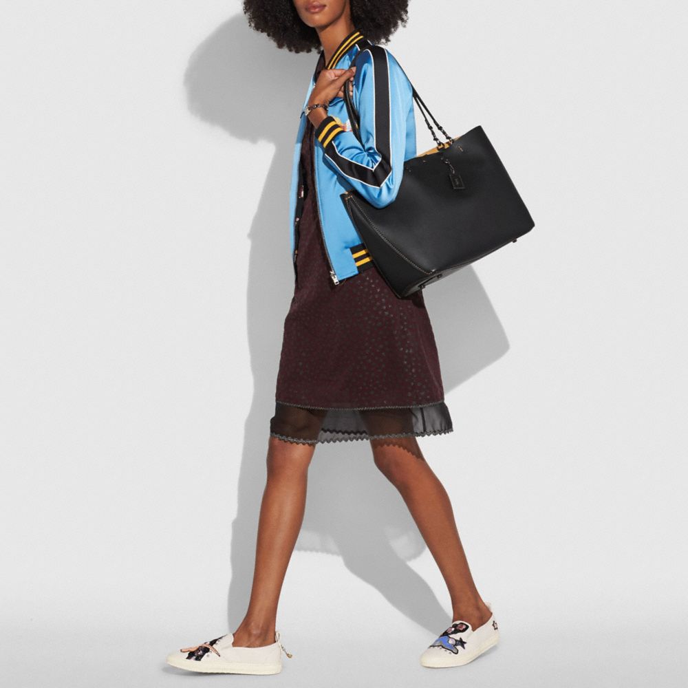 Glove calf leather| Removable zip pouch | Dogleash clip closure| Handles with 3 3/4" drop| Detachable straps with 11 1/2" drop for shoulder wear| Shoulder straps can be linked together for crossbody wear| Compatible with Coach interchangeable straps | 12 1/2" (L) x 11" (H) x 6 3/4" (W)