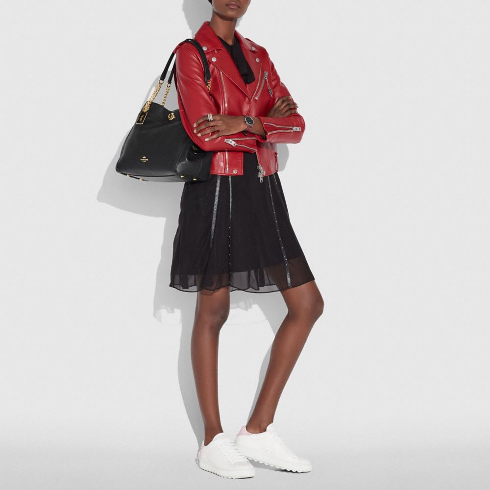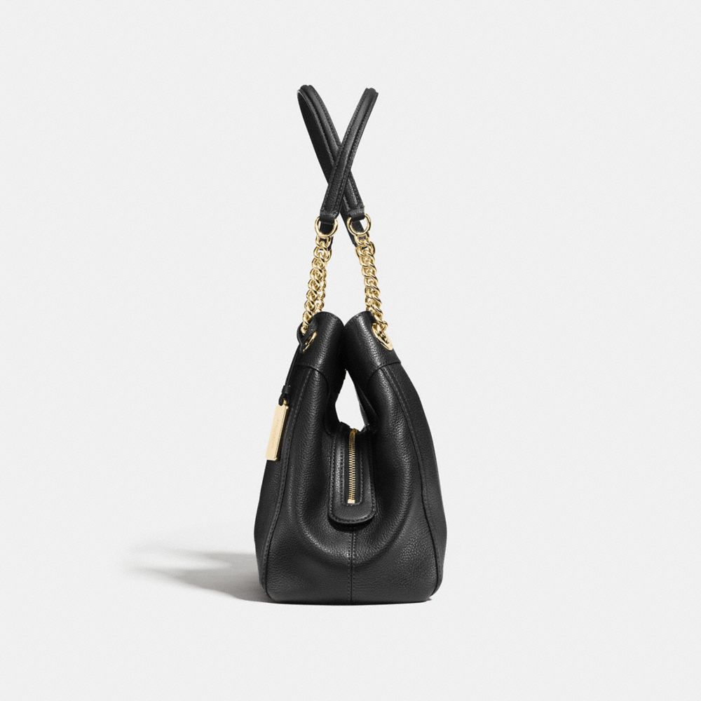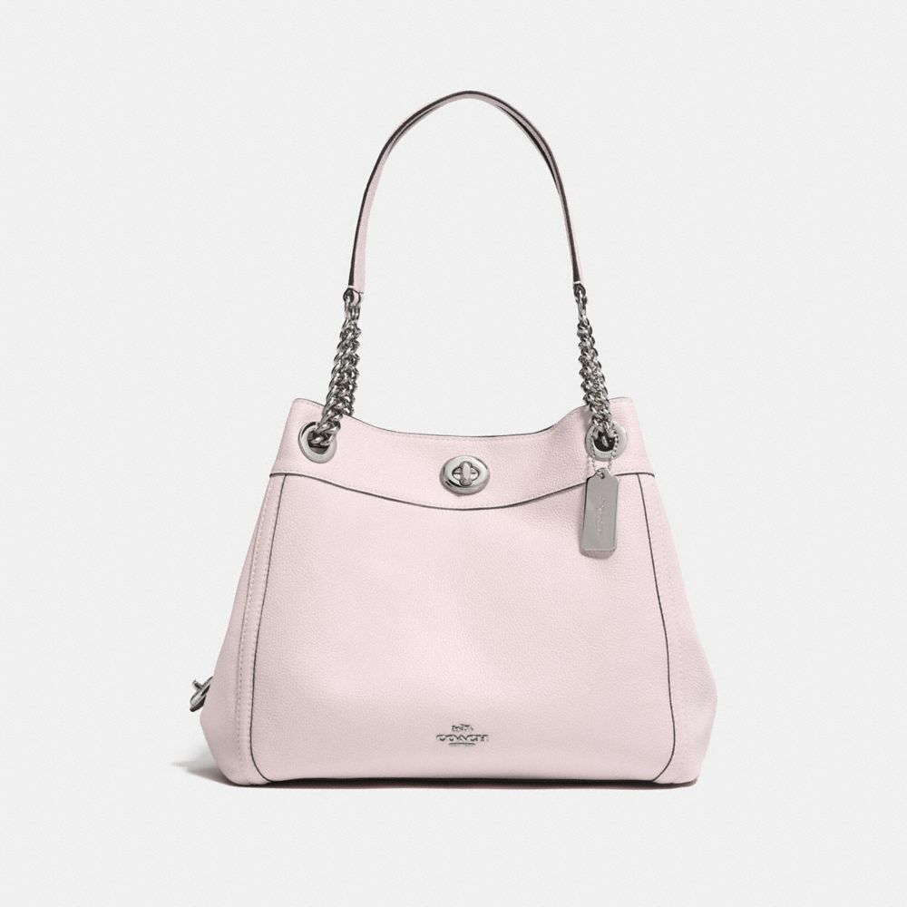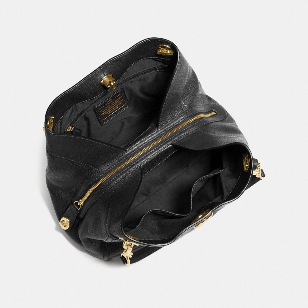 Polished pebble leather| Inside zip, cell phone and multifunction pockets| Center zip compartment| Turnlock closure, fabric lining| Handles with 9 1/2" drop| 12 3/4" (L) x 11" (H) x 5 3/4" (W)