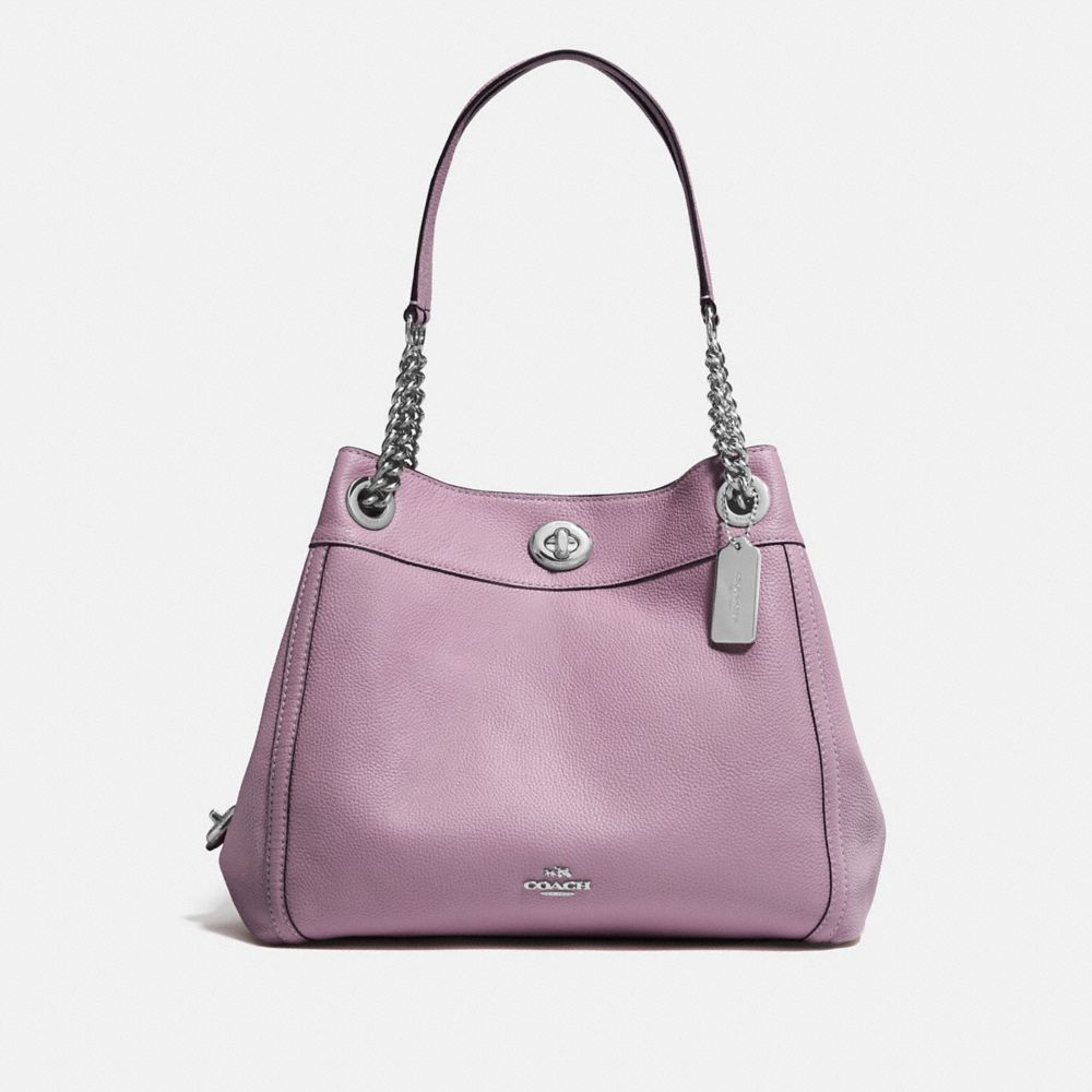 Polished pebble leather| Inside zip, cell phone and multifunction pockets| Center zip compartment| Turnlock closure, fabric lining| Handles with 9 1/2" drop| 12 3/4" (L) x 11" (H) x 5 3/4" (W)
