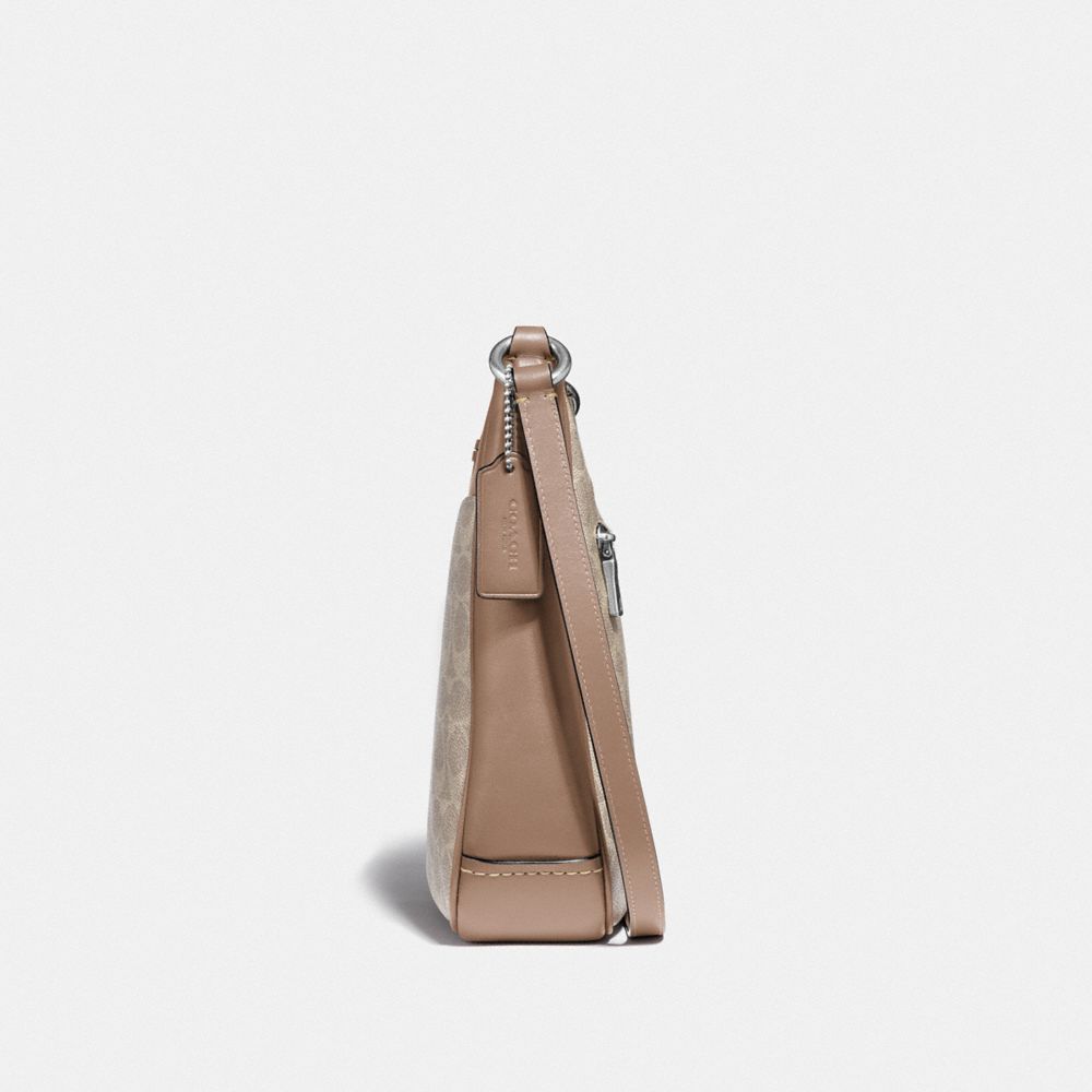 Signature coated canvas and refined calf leather| Inside multifunction pocket| Zip-top closure, fabric lining| Outside zip and snap pockets| Adjustable strap with 21 1/2" drop for shoulder or crossbody wear| 8 3/4" (L) x 9 3/4" (H) x 2 3/4" (W)