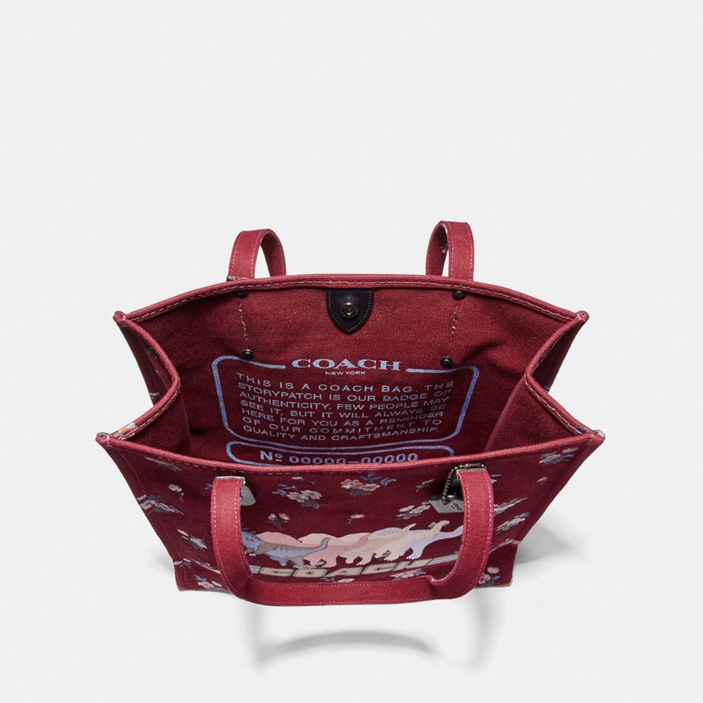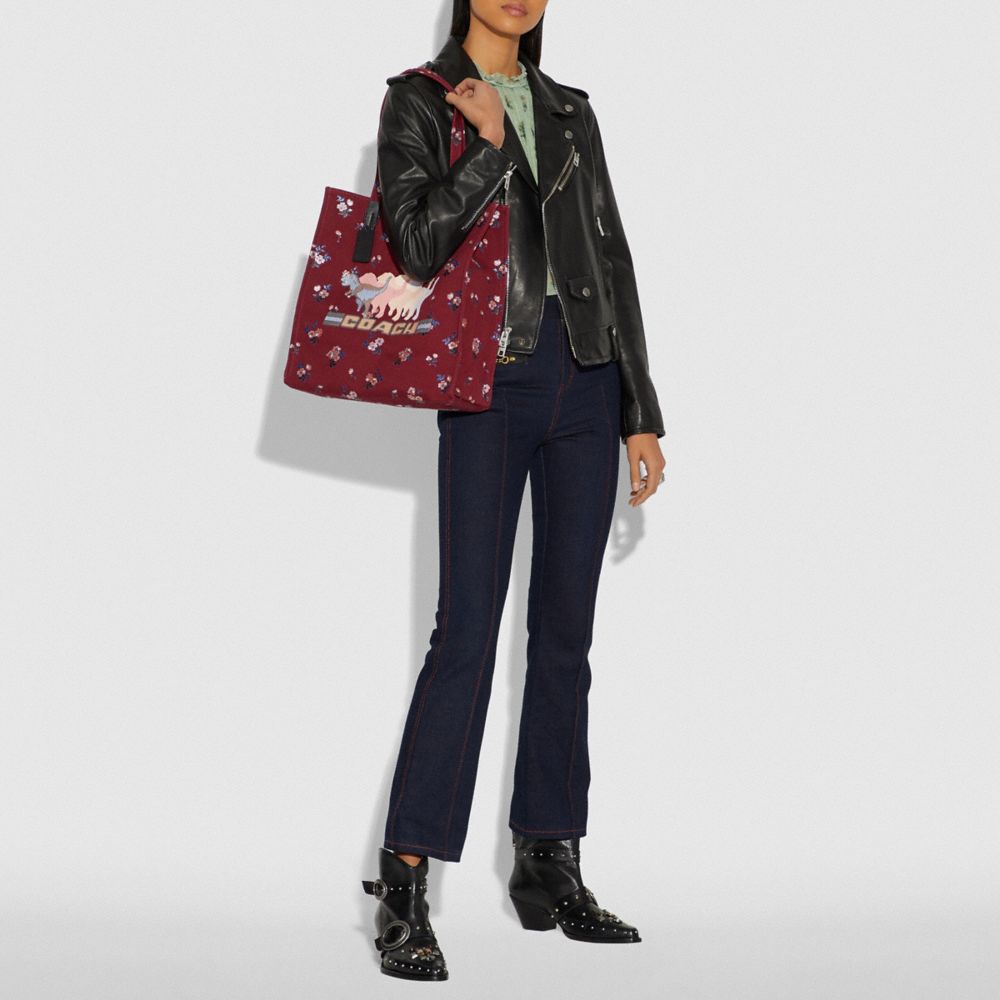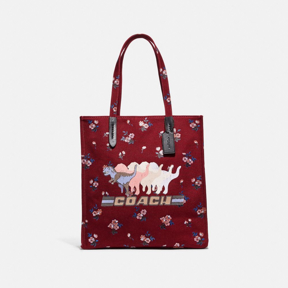 Printed canvas with smooth leather details| Snap closure| Handles with 9 1/2" drop| 13 1/2" (L) x 14 1/4" (H) x 5" (W)