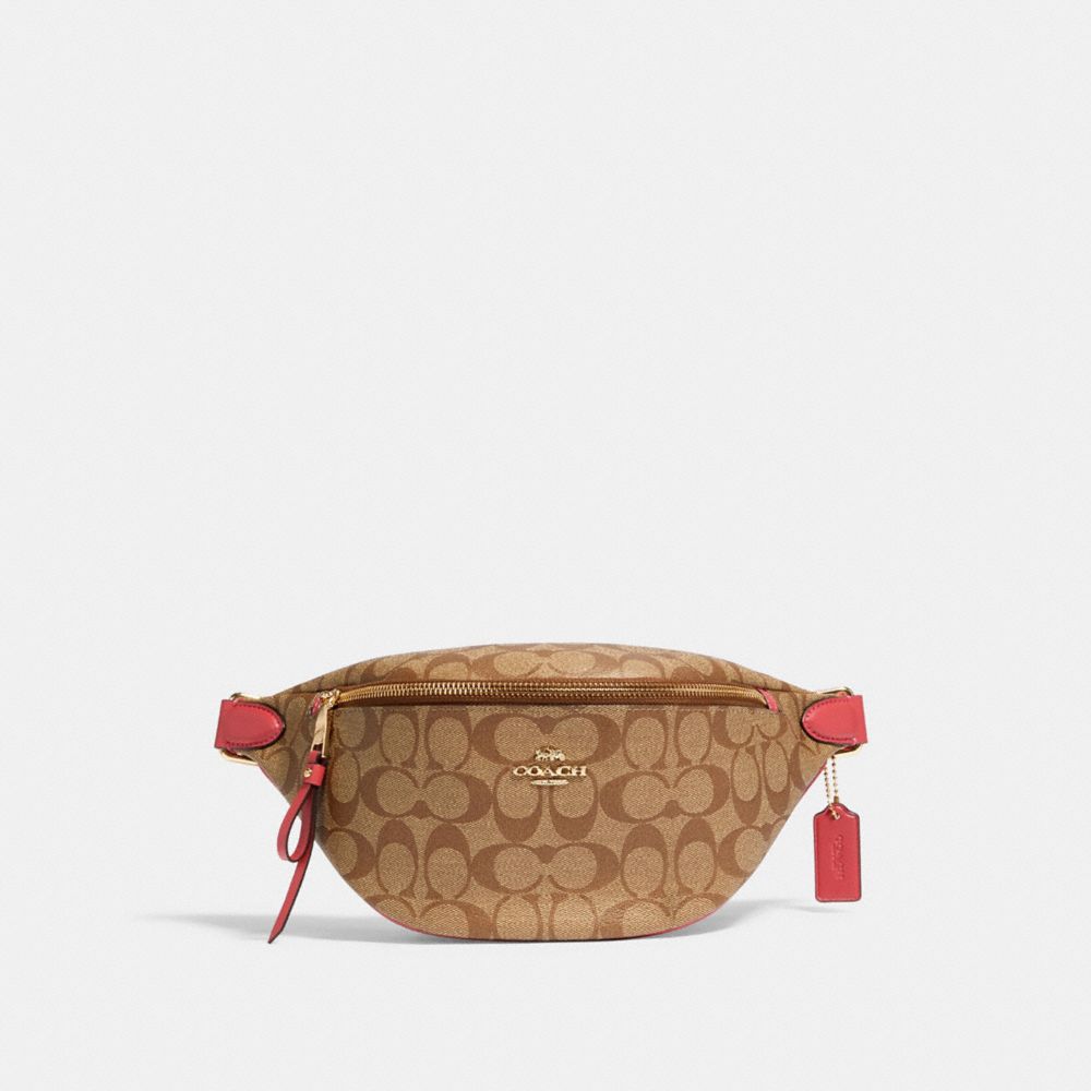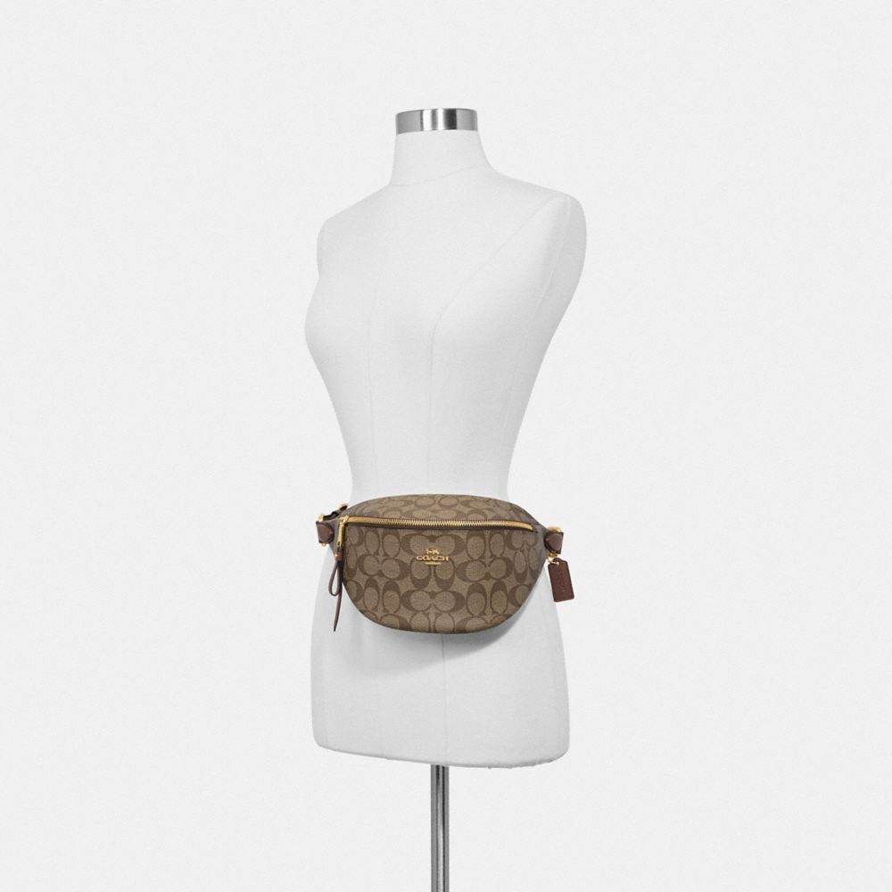 Signature coated canvas with smooth leather details| One credit card slot| Zip closure, fabric lining| Adjustable strap for wear at waist| 14 1/4" (L) x 5" (H) x 4 1/4" (W)