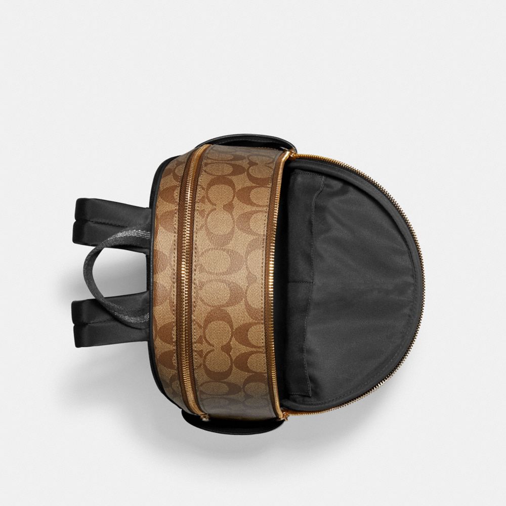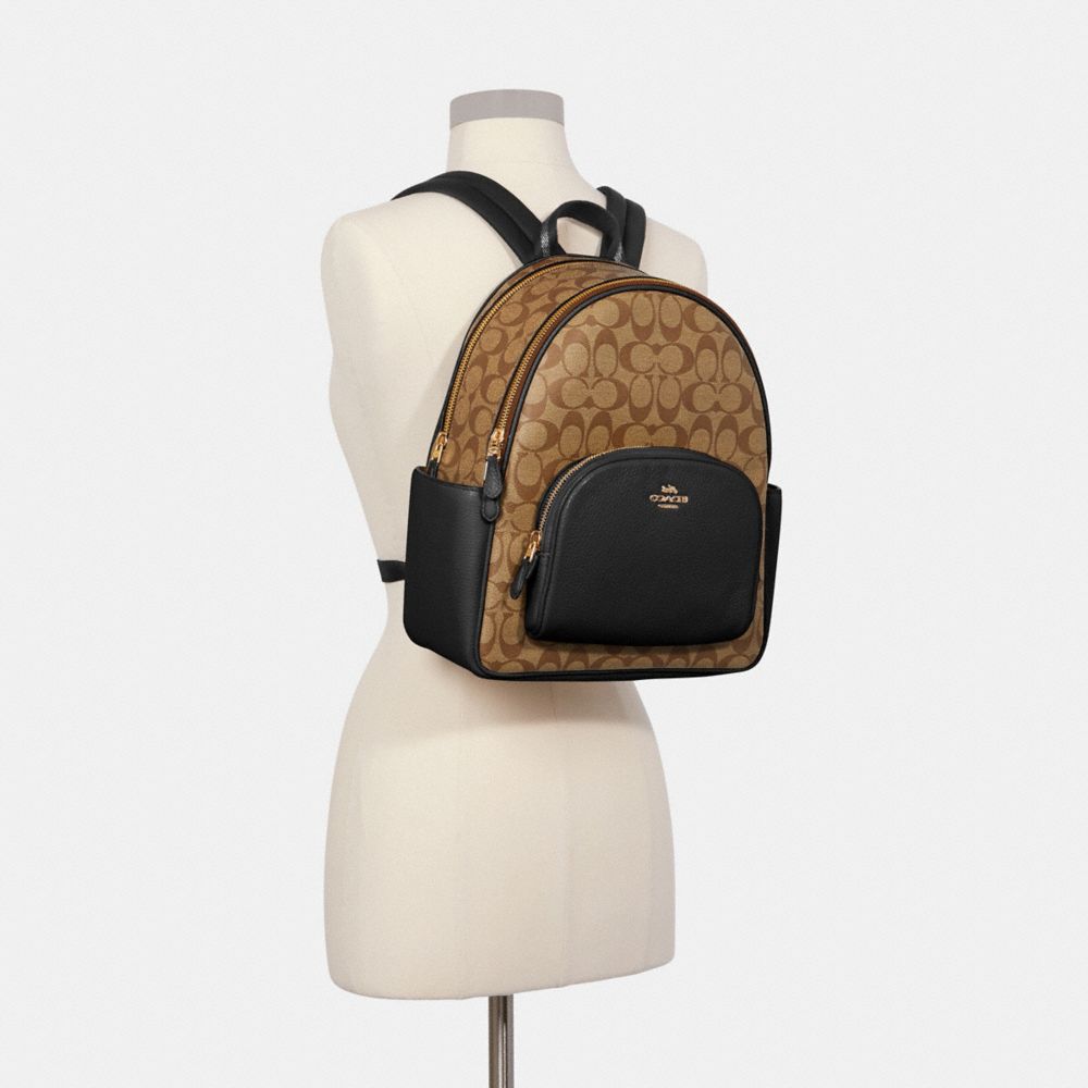 Signature coated canvas and refined pebble leather| Inside zip and slip pockets| Zip closure, fabric lining| Handle with 2 1/4" drop| Outside zip pocket| Adjustable shoulder straps| 10 1/2" (L) x 14 1/4" (H) x 5" (W)