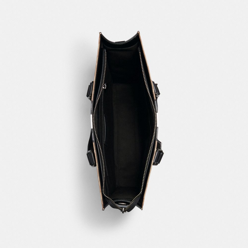 Signature coated canvas and refined calf leather| Inside zip, cell phone and multifunction pockets| Zip-top closure, fabric lining| Handles with 7 3/4" drop| Detachable strap with 25" drop for shoulder or crossbody wear| 14" (L) x 14 1/2" (H) x 3 1/4" (W)