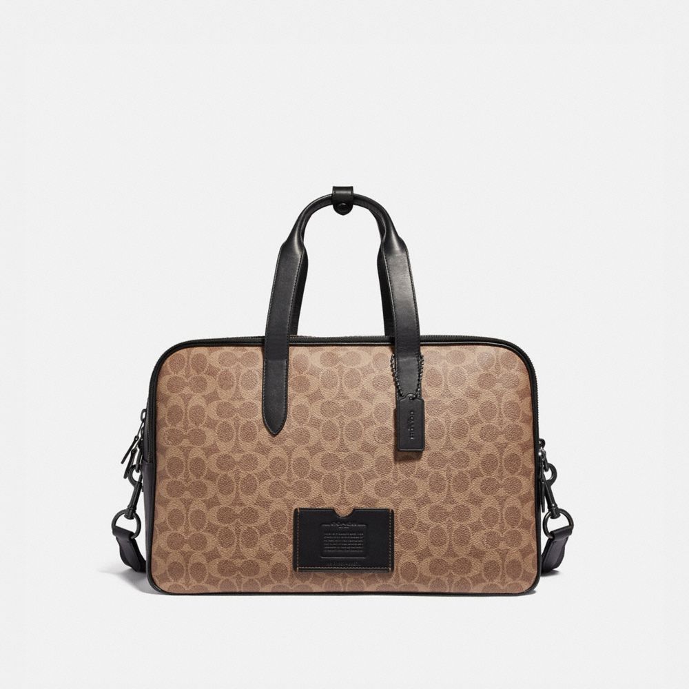 Signature coated canvas and refined calf leather| Inside zip, cell phone and multifunction pockets| Inside laptop sleeve with secure tab| Three interior compartments| Zip closure, fabric lining| Handles with 6 1/4" drop| Outside zip pocket| Outside Storypatch card slot| Detachable strap with 25" drop for shoulder or crossbody wear| 15 3/4" (L) x 10 1/4" (H) x 5 1/2" (W)Style No. 69370